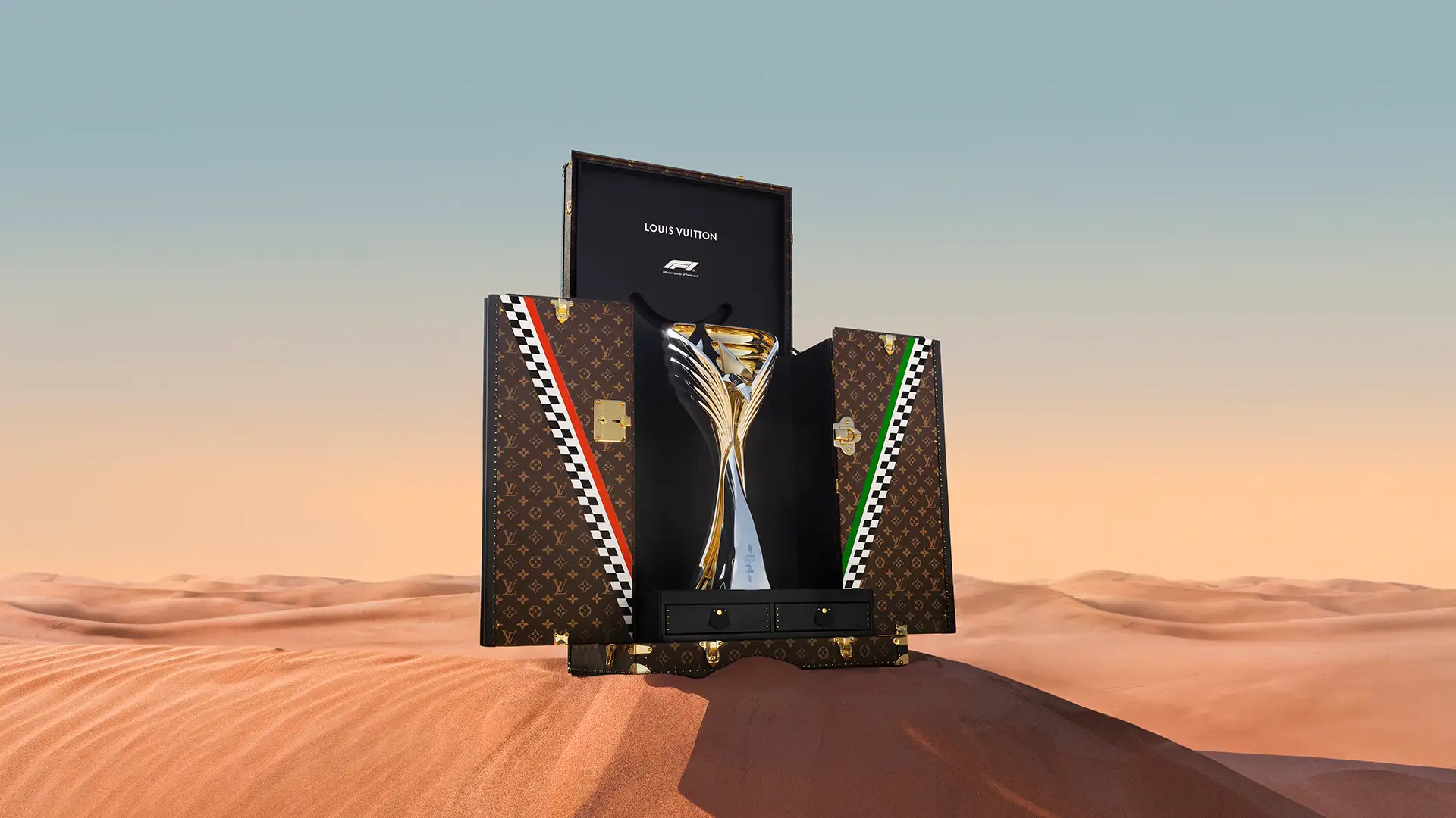 2025年シーズンの各レースの優勝者に授与されるフォーミュラ1®のトロフィーを大切に守り、展示するために設計されたトロフィー·トランクは、開催順に並べられました。「フォーミュラ1®ルイ·ヴィトン オーストラリア グランプリ 2025」のトロフィー·トランクにはじまり、「フォーミュラ1®カタール航空 イギリス グランプリ2025」、「フォーミュラ1®モエ·エ·シャンドン ベルギー グランプリ 2025」、そしてクライマックスとなる「V」字形ディスプレイの最前部には、「フォーミュラ1®エティハド航空 アブダビ グランプリ 2025」のトロフィー·トランクが。シーズンの締めくくりにふさわしいこの演出で、スターティンググリッドが、世界最高峰のモータースポーツとメゾンのクラフツマンシップを讃える真の祝典へと変貌しました。