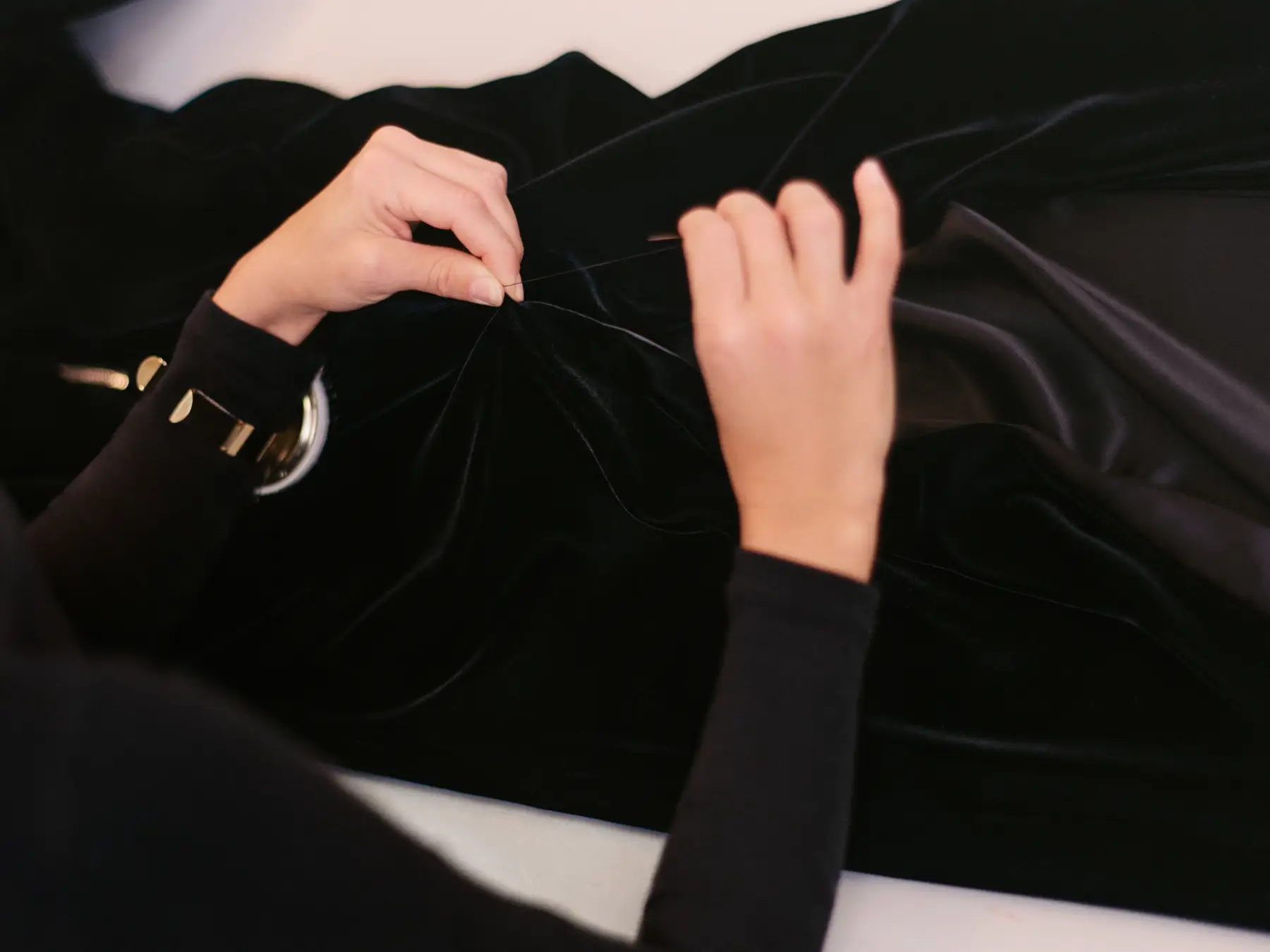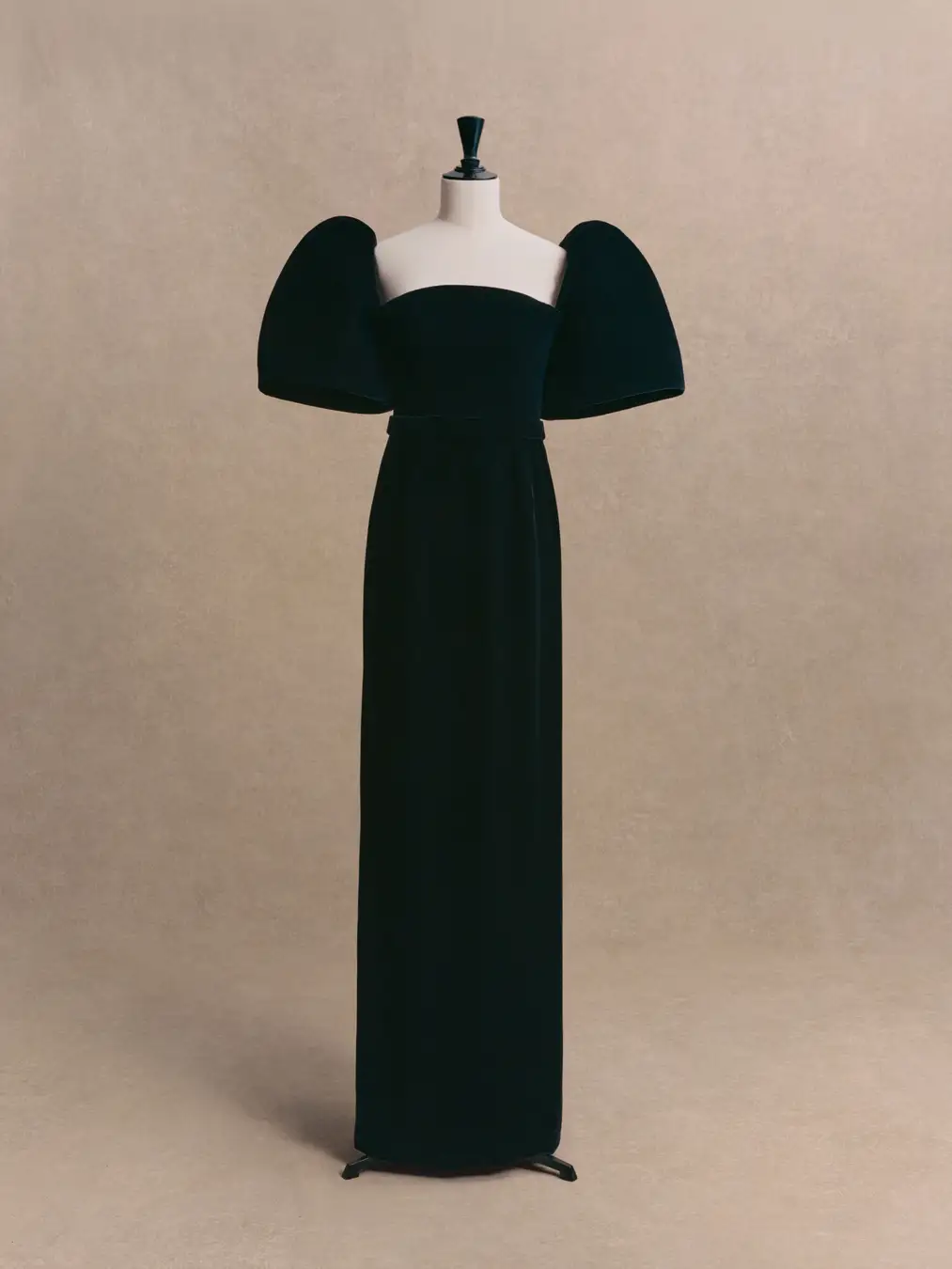 ブラックのシルクベルベット製ビスチェ型ロングドレスは、ストレートなデコルテとボリューム感のある短いチューリップスリーブが特徴。デコルテのシャープでグラフィカルなラインが、スリーブの垂直なアームホールラインと美しく交差しています。