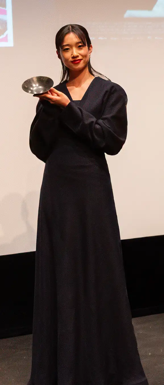 河合優実は、足元まで優雅に流れ落ちるウールのフレアスカートが印象的なブルーブラックのドレスを着用し、シルバーのトウキャップが輝くブラックレザーのブーツを合わせました。柔らかで上品なシルエットが、新鋭才能賞を受賞した河合優実の魅力を一層引き出しています。