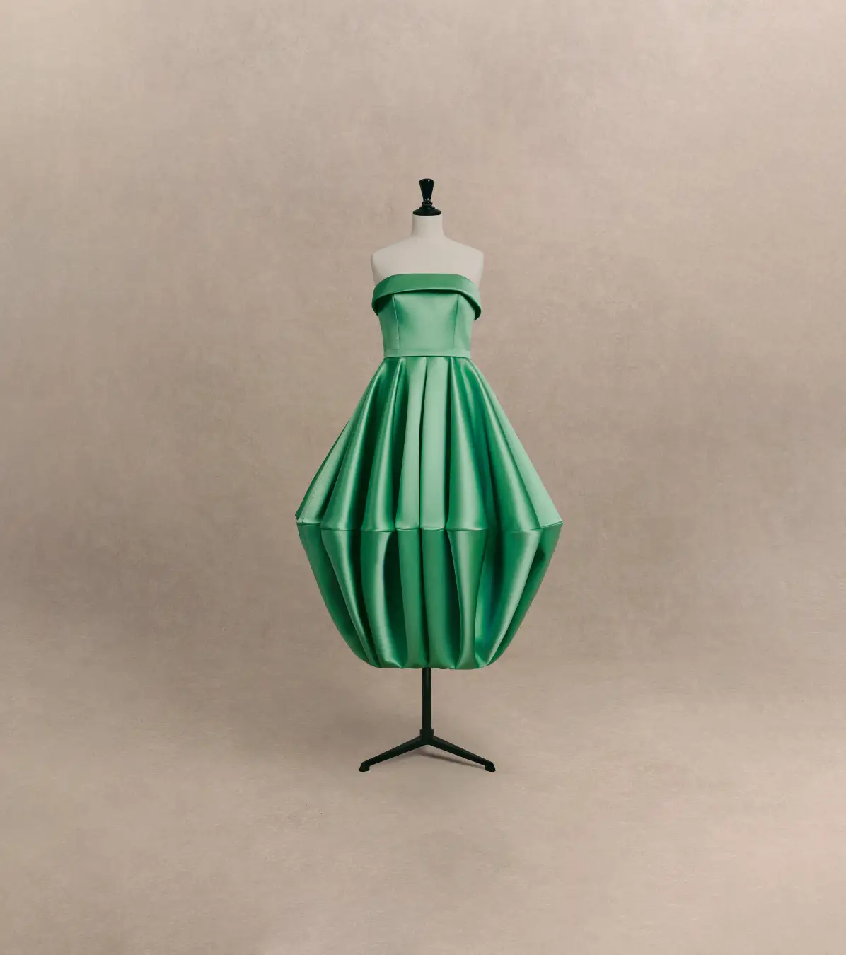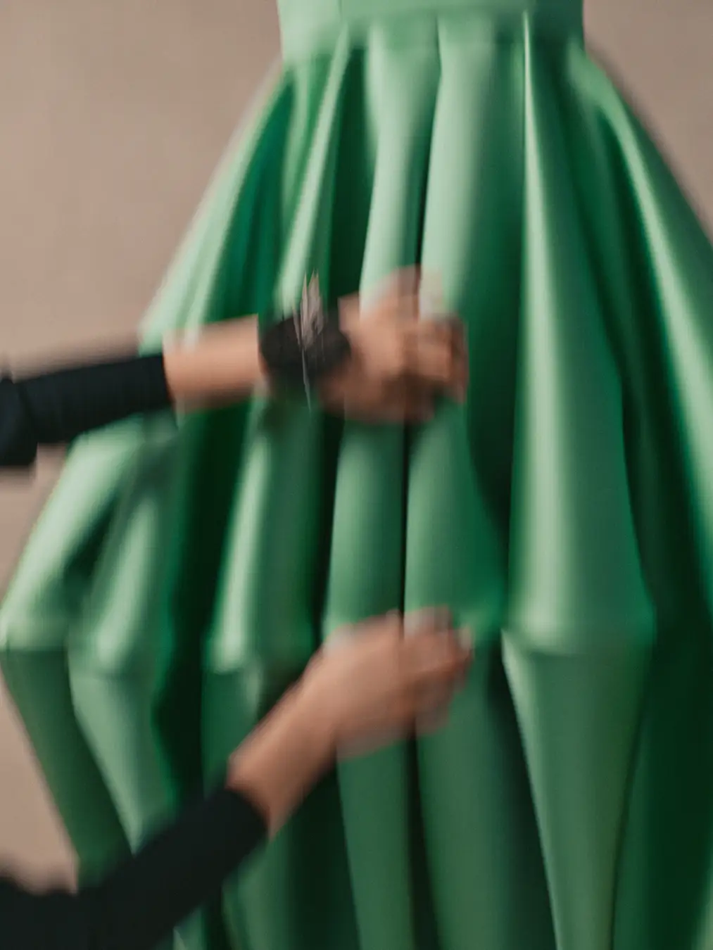 エリン·ドハティが着用した淡いエメラルドグリーンのデュシェスサテンドレスは、フロントからバックにかけて施された洗練されたリバーがビスチェネックラインを美しく際立たせています。シャープな水平カットによってバルーンのようなボリュームを生み出したアンクル丈のスカートは、彫刻的で幾何学的なゴデを形成し、裾では均一なプリーツとしてまとめられ、ウエストラインではフラットに仕上げられています。このドレスの制作には約300時間以上もの時間が費やされています。