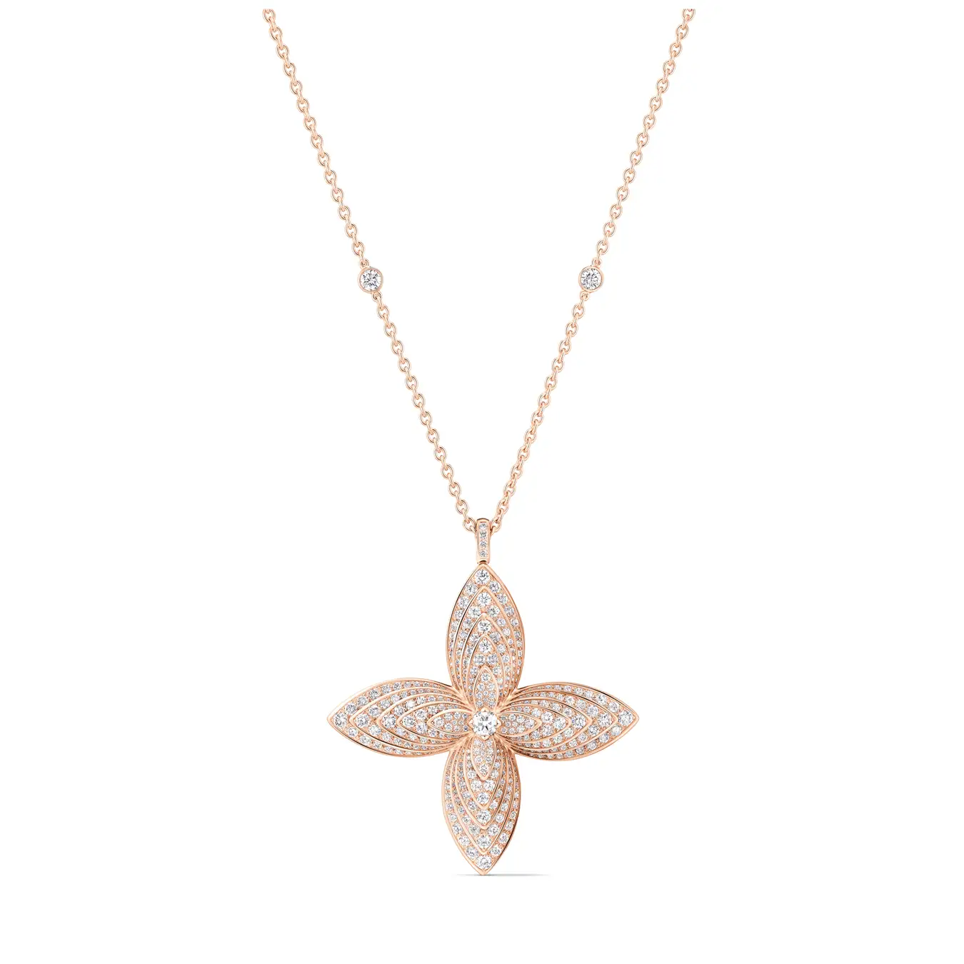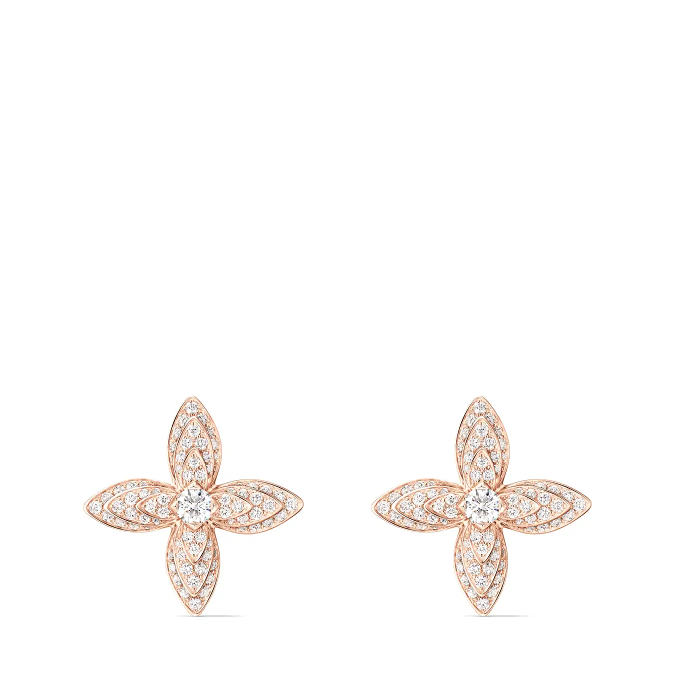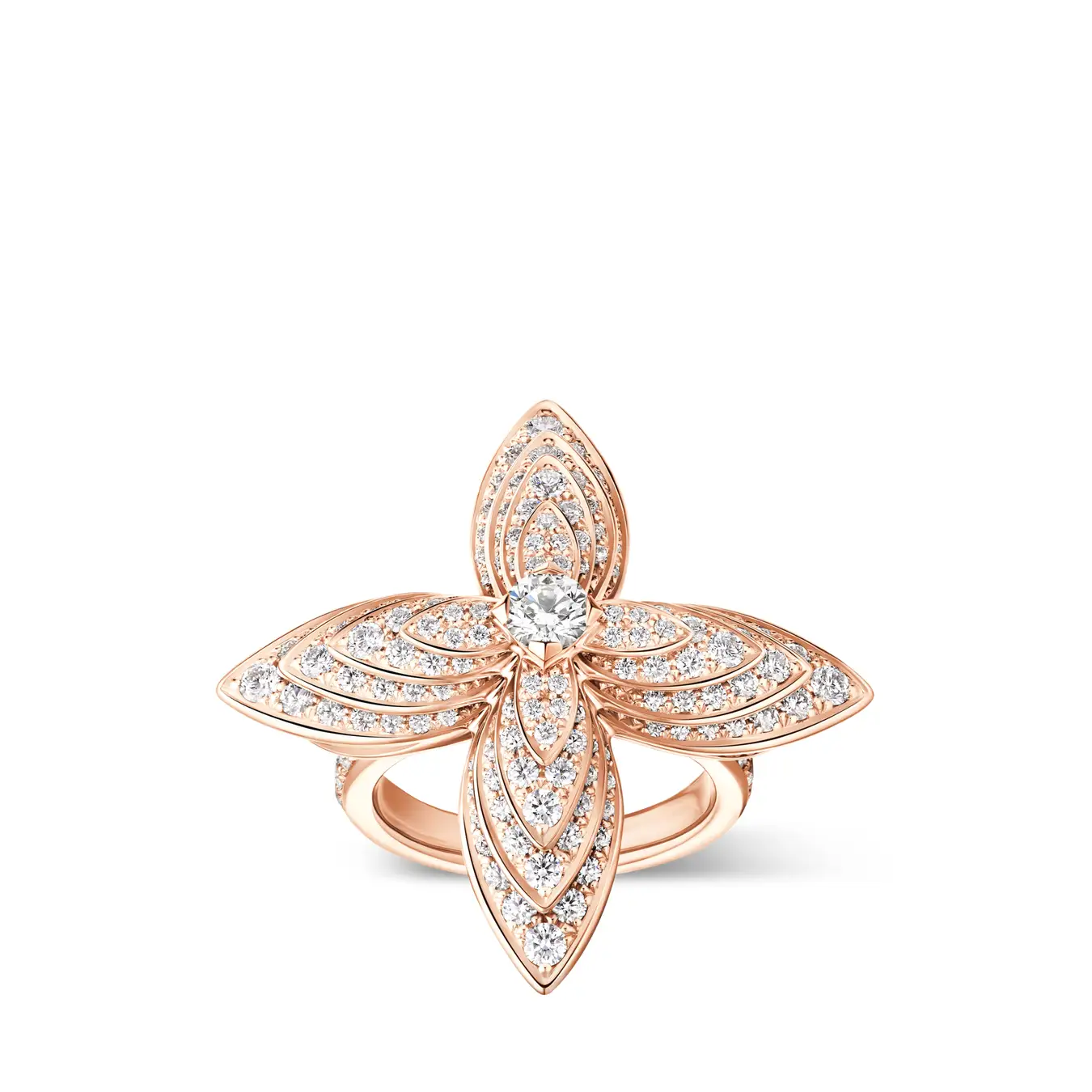 ブリリアントカットダイヤモンドをセットした、柔らかなピンクのプレシャスメタルに、精緻なテーパードシェイプの花びらが優美な層を成して連なり、またとない独創性に溢れたフラワー·モチーフとなっています。