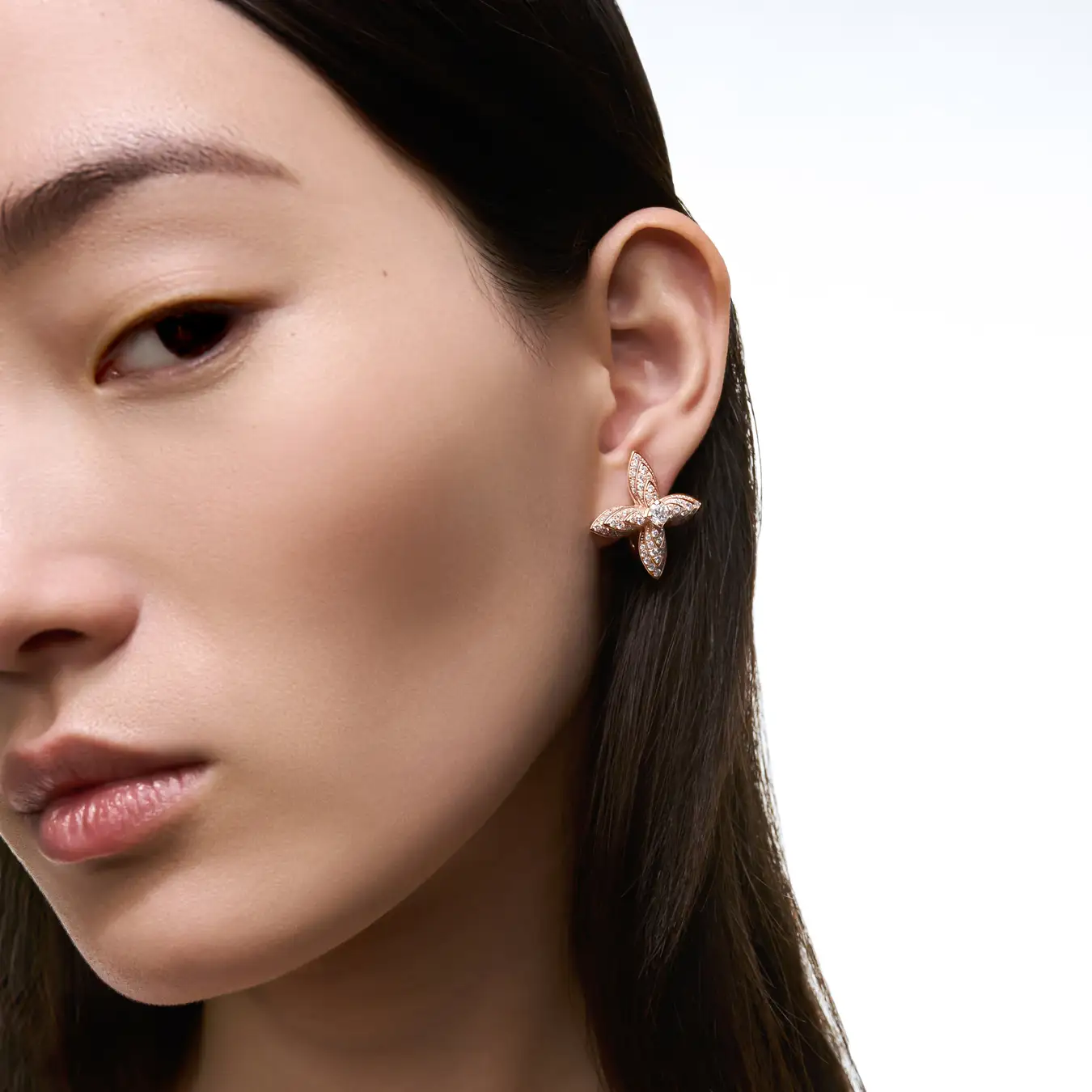 当初、ホワイトゴールドとダイヤモンドの組み合わせで登場した、スレンダーなモノグラム·フラワーが、今回は目を奪われるほど魅惑的に輝く、ローズゴールドの新しいバリエーションとなって姿を現します。強く光輝くペンダント、顔周りを瞬く間に輝かせる優美で洗練されたピアス、目を見張るほどに壮麗な唯一無二のリングの中心で、モノグラム·フラワーが咲き誇っています。