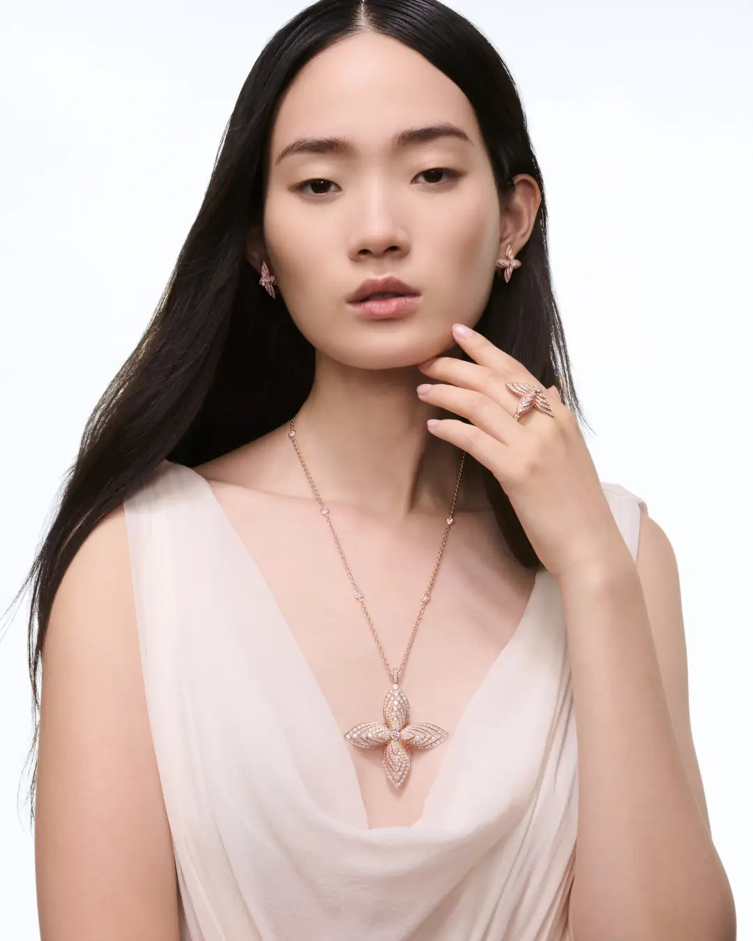 新たなエスプリが吹き込まれた「イディール ブロッサム」は、これまでにないハイジュエリーのクリエーションの新章を展開。どのジュエリーピースも、ルイ·ヴィトンのモノグラム·フラワーが時を経て変遷するストーリーを紡ぎ、新しいエッセンシャルとなるジュエリーの独創的な物語が、プレシャスなパウダーピンクのメタルやジェムストーンに刻まれます。