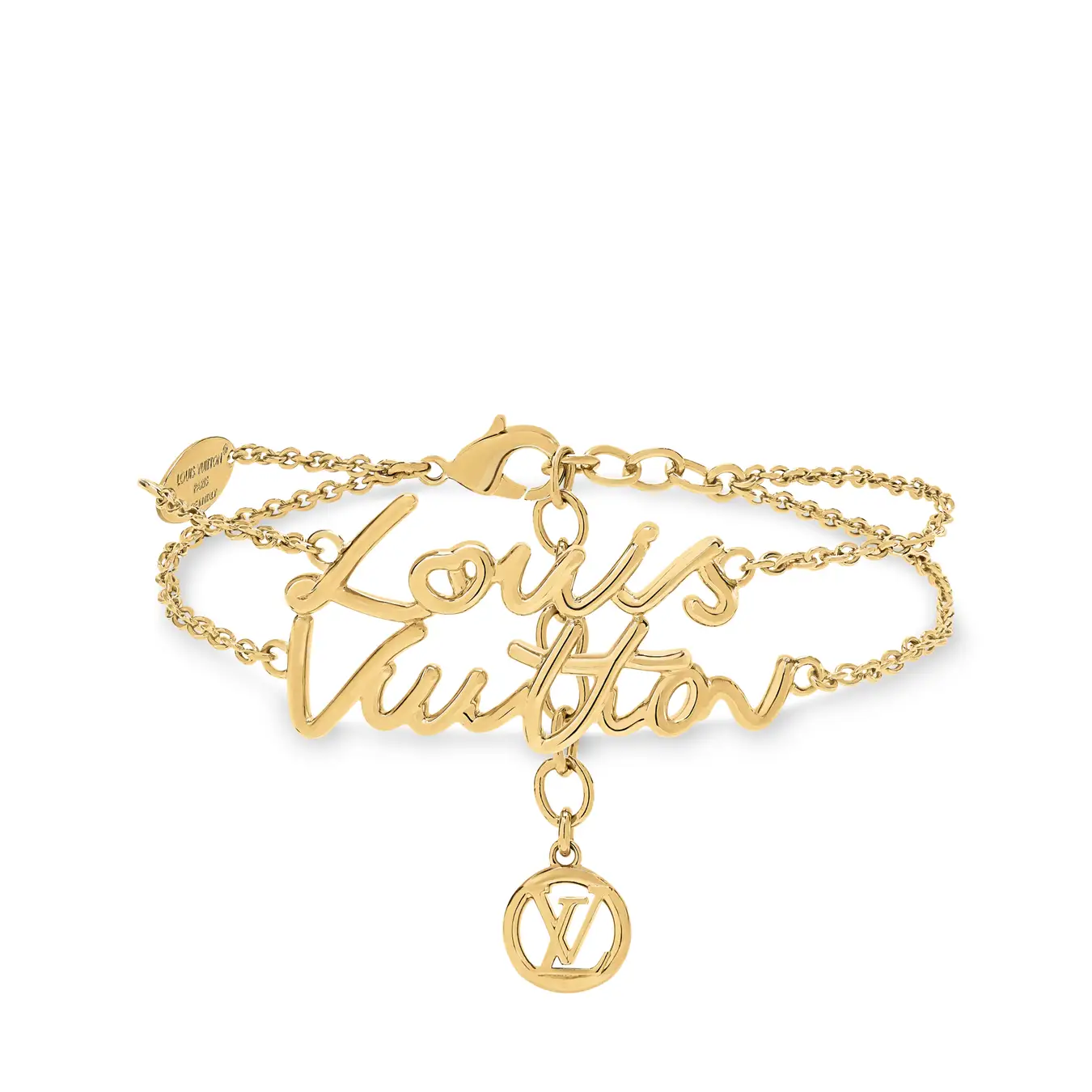 2025年春夏ファッションショーで注目され、ルイ·ヴィトンの新しいシグネチャーをあしらった、「ブレスレット·LV スクリプト」。光沢感のあるゴールドカラーのメタルで仕上げたアイテムです。2本のチェーンを繋げて仕上げられ、それぞれにはメゾンの名が滑らかで流れるような手書き風で施され、独特のデザインが光ります。単体でも重ね着けでも、あらゆる装いにチャーミングな華やかさを添えます。