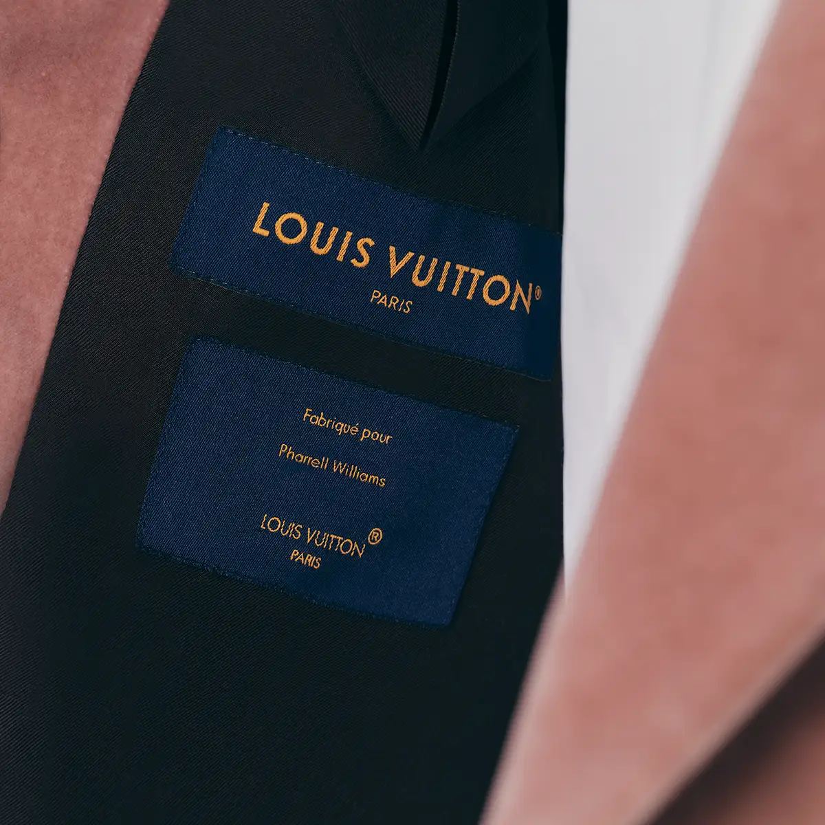 ファレル·ウィリアムスとクリプスがレッドカーペットで着用したウエアは、コットンとシルクのピンクベルベット素材で仕立て、シルクの裏地とマザー·オブ·パール ボタンを使用し、各ジャケットの内側にはカスタムのジャカードラベルが付いています。