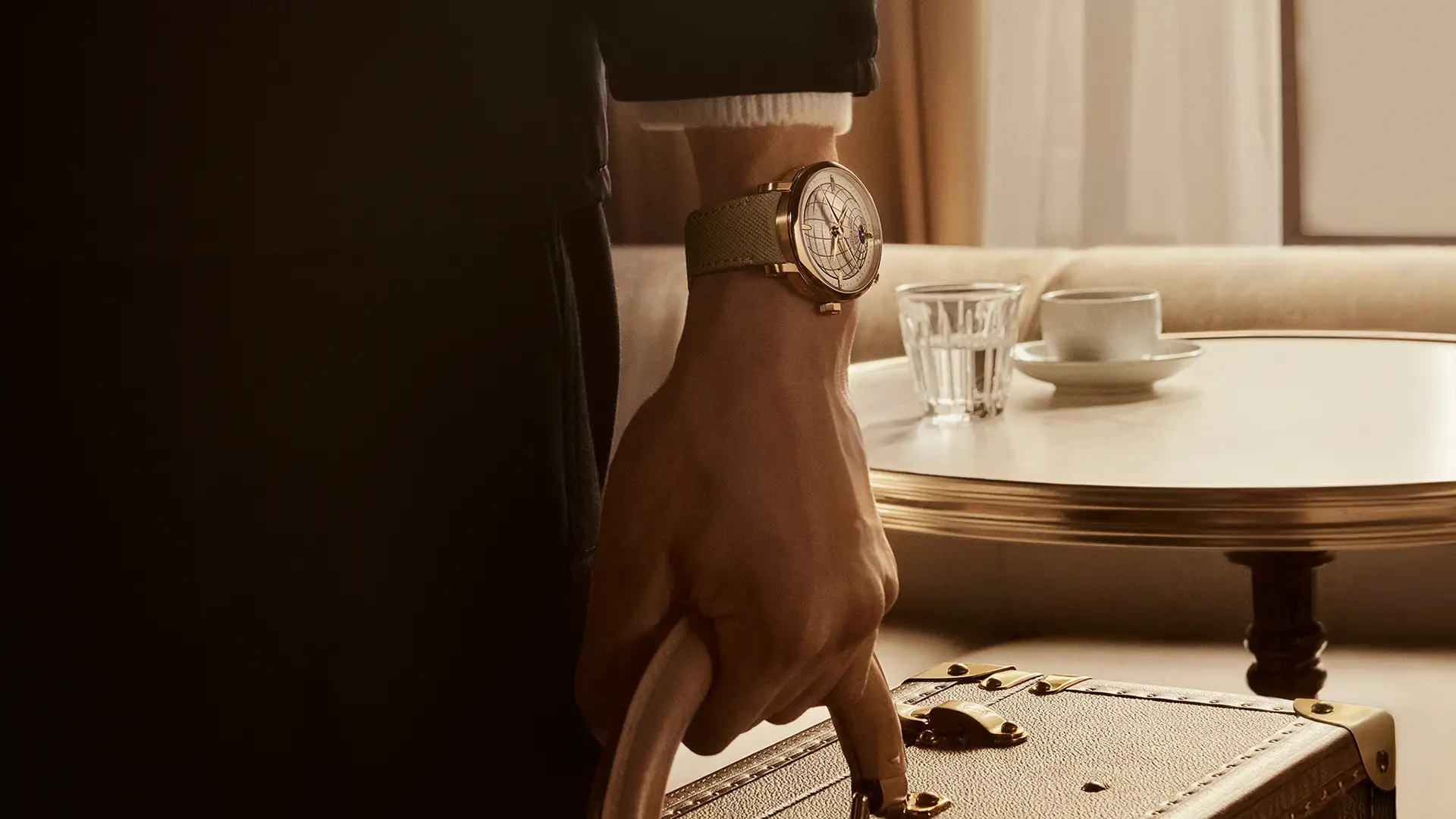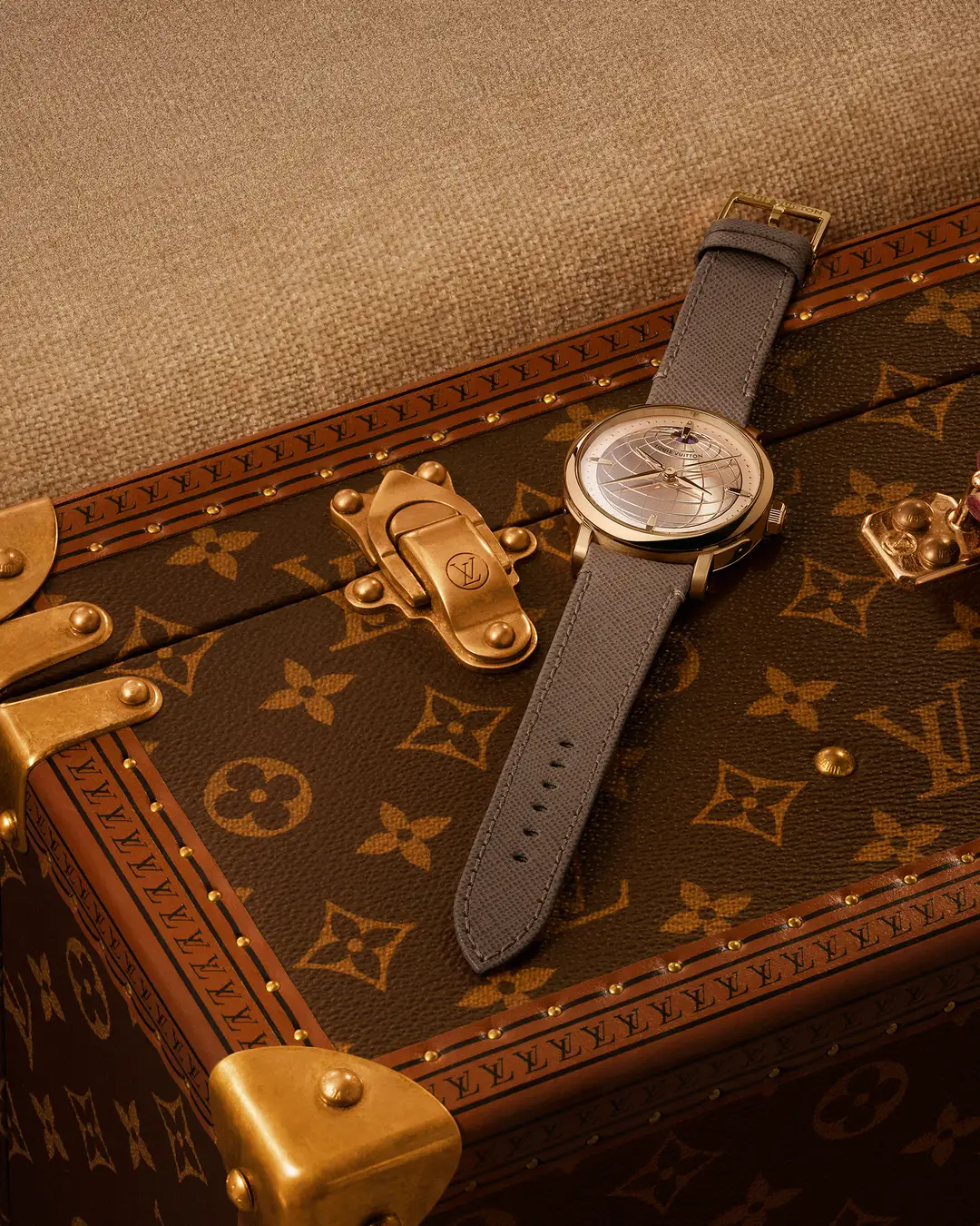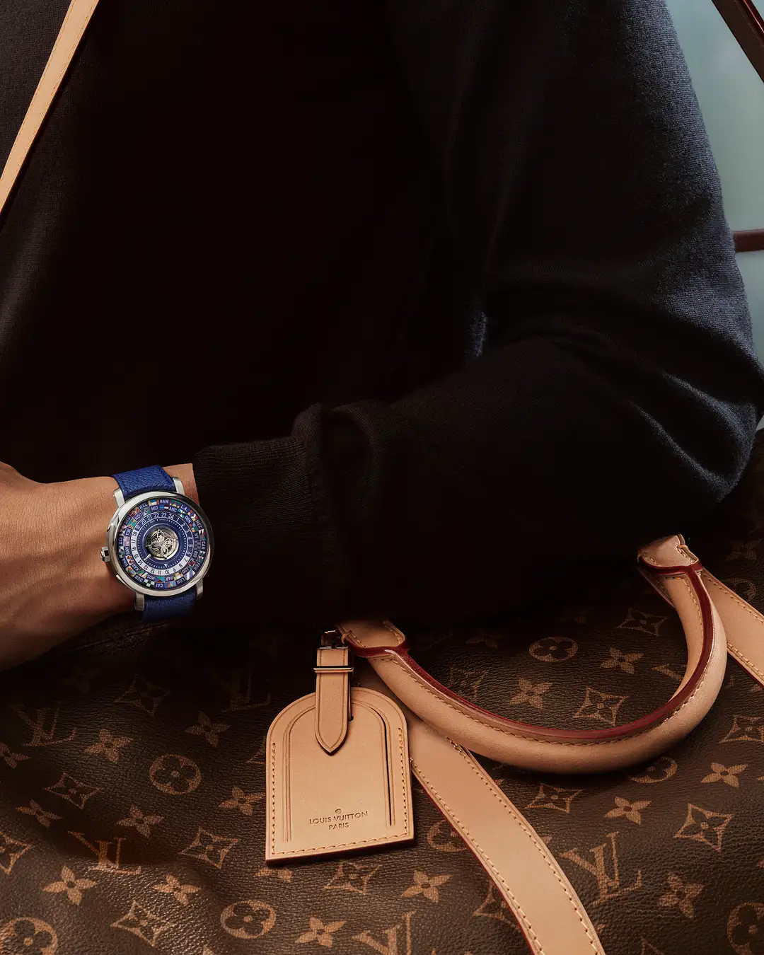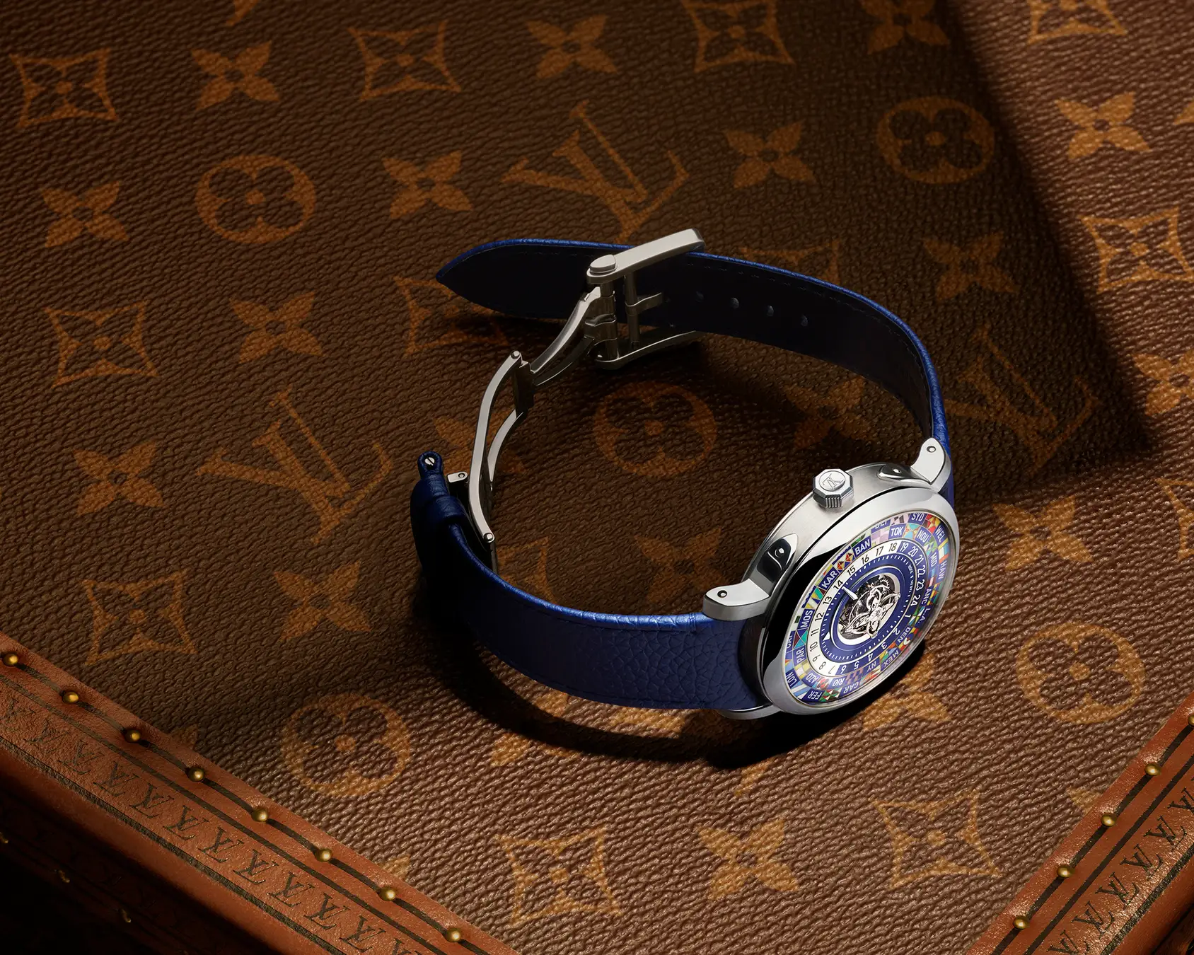 1つ目のモデルは、ミニチュアペインティングで描いたワールドタイムリングと、歴史的なモノグラム·キャンバスの質感を讃え、時刻の読み取りやすさを高めるために、洗練されたグレイン仕上げのブルーセンターダイアルでアイコンを再解釈。馴染み深いワールドタイムのモチーフはそのままに、新開発の自社製LFT VO 12.01ムーブメントが複雑機構を昇華させ、アイコンの新たな時代を告げます。