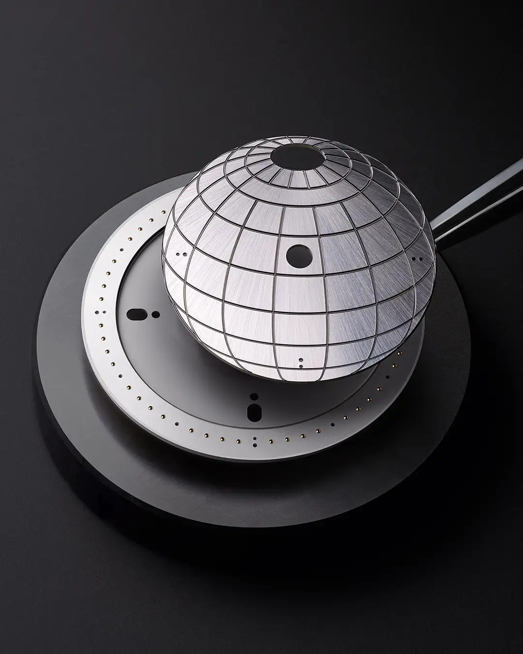 伝統的なローズエンジンを用いて手作業により仕上げられた中央のダイアルは、中心から放射状に広がり、光を捉え反射するフレイムギョーシェ模様に彩られています。工具による作業を幾度も重ねて、揺るぎない繊細さで仕上げられたモチーフは、深さと圧力の両面で卓越した均一性を実現。光を放つ表面が、レトログラード分針へと視線を惹き付けます。合計60時間を費やし熟練の技を駆使して完成したギョーシェ彫りのダイアルは、その後、特徴的なグレーの色合いを出すために、丹念な着色作業が行われます。
