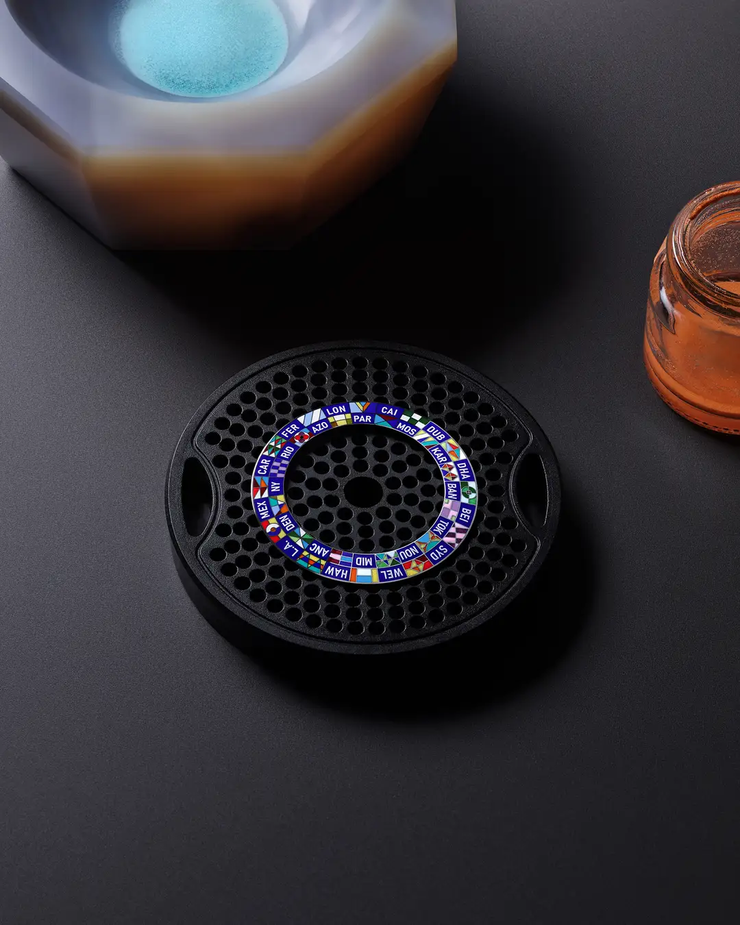 「エスカル ワールドタイム トゥールビヨン」のダイアルを取り囲むフラッグは、通常の顔料ではなく、すべてエナメル技法で表現されています。それぞれの色は手作業で塗布され、730°Cから840°Cの温度で5つの異なる層に40回以上の焼成をという工程を経て完成。鮮やかなグリーンや柔らかなピンクの色合いは非常に繊細で、1、2度の焼成にしか耐えられないため、最後に施されます。そして完成したエナメルディスクを丁寧に研磨すると、並外れた深みと輝きを放つのです。ダイアルの製作には、熟練のエナメル職人による2週間(80時間)にわたる緻密な作業が求められます。