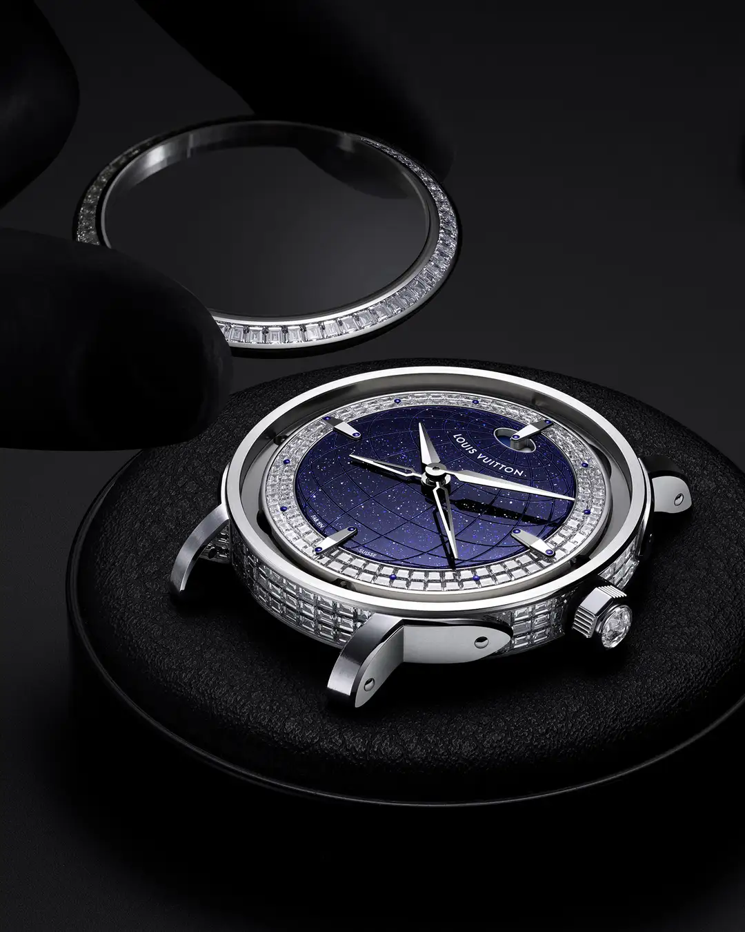 ダイアルの緻密なジェムセッティングは、経線と緯線が刻まれたアベンチュリンの中心を囲む120個のバゲットカットダイヤモンドをフィーチャー。バゲットセッティングのダイアルフランジに配された、時間を示すブルーのスタッズは、アベンチュリンの深いブルーを反映し、ダイアルのあらゆる要素を調和させる視覚的なハーモニーを生み出しています。