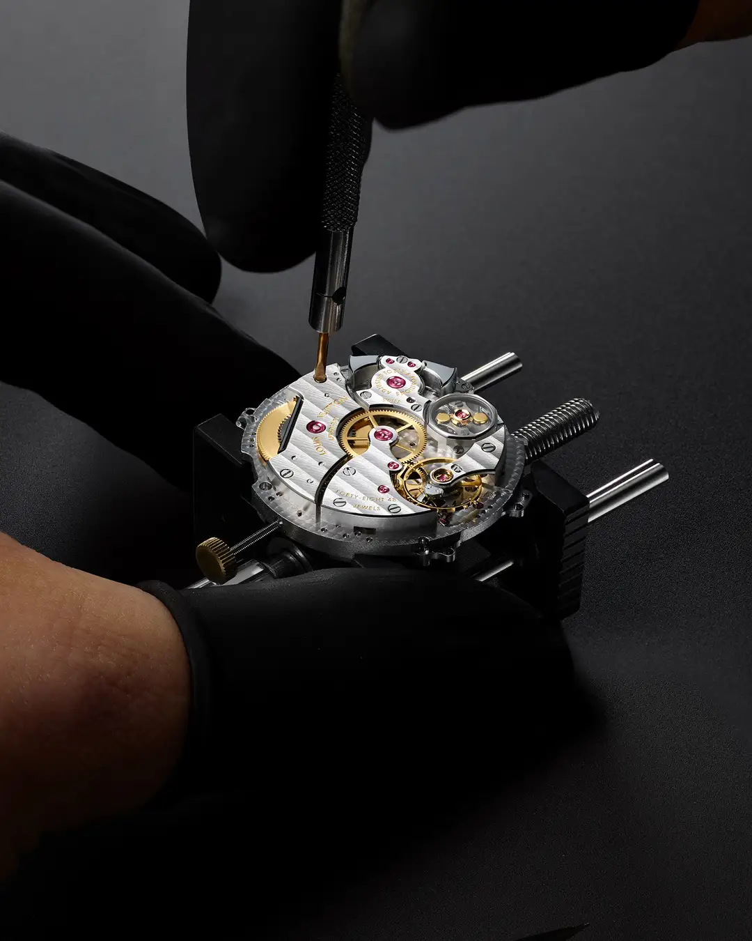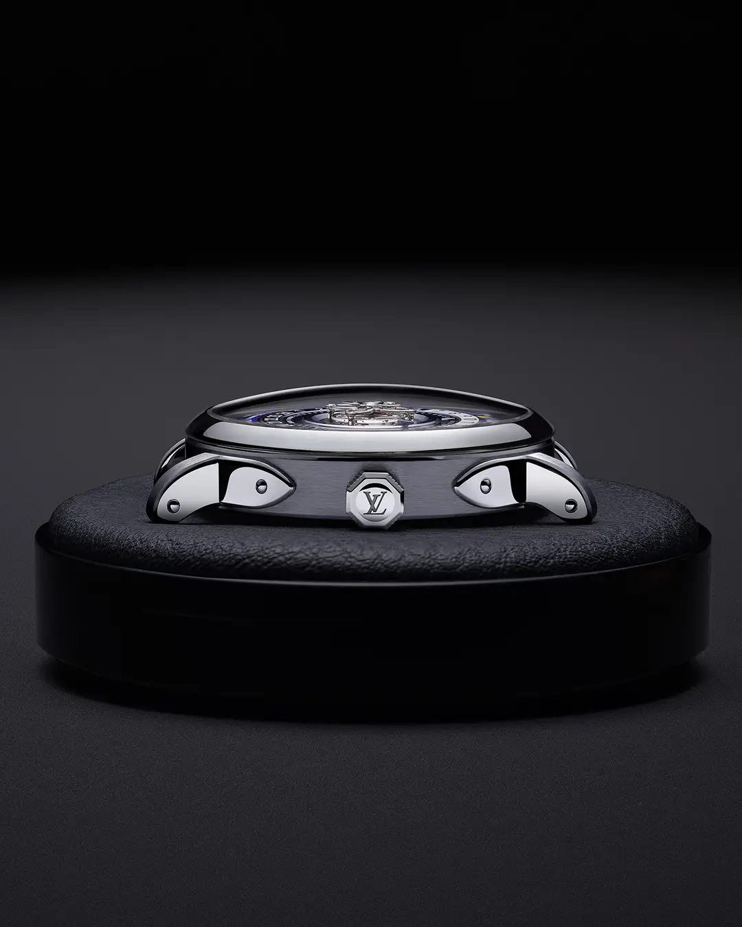 キャリバーの音響要素はすべてが完璧に調整されています。ブラックポリッシュ仕上げのハンマーとゴングは手作業で成形、切削、調整され、最適な振動と振幅を確保。熟練の職人の耳を頼りに、丹念にチューニングされ、驚くべき明瞭さと音量を備えたクリスタルのような音色を実現。ミニッツ·リピーターの音は、ほぼ無音の遠心調速機のおかげで明瞭に響きわたります。ジェンタの比類なき美学を彷彿させる八角形のブリッジによって固定されたこの機構が、ルイ·ヴィトンとジェラルド·ジェンタのレガシーを目に見える形で結び付けています。