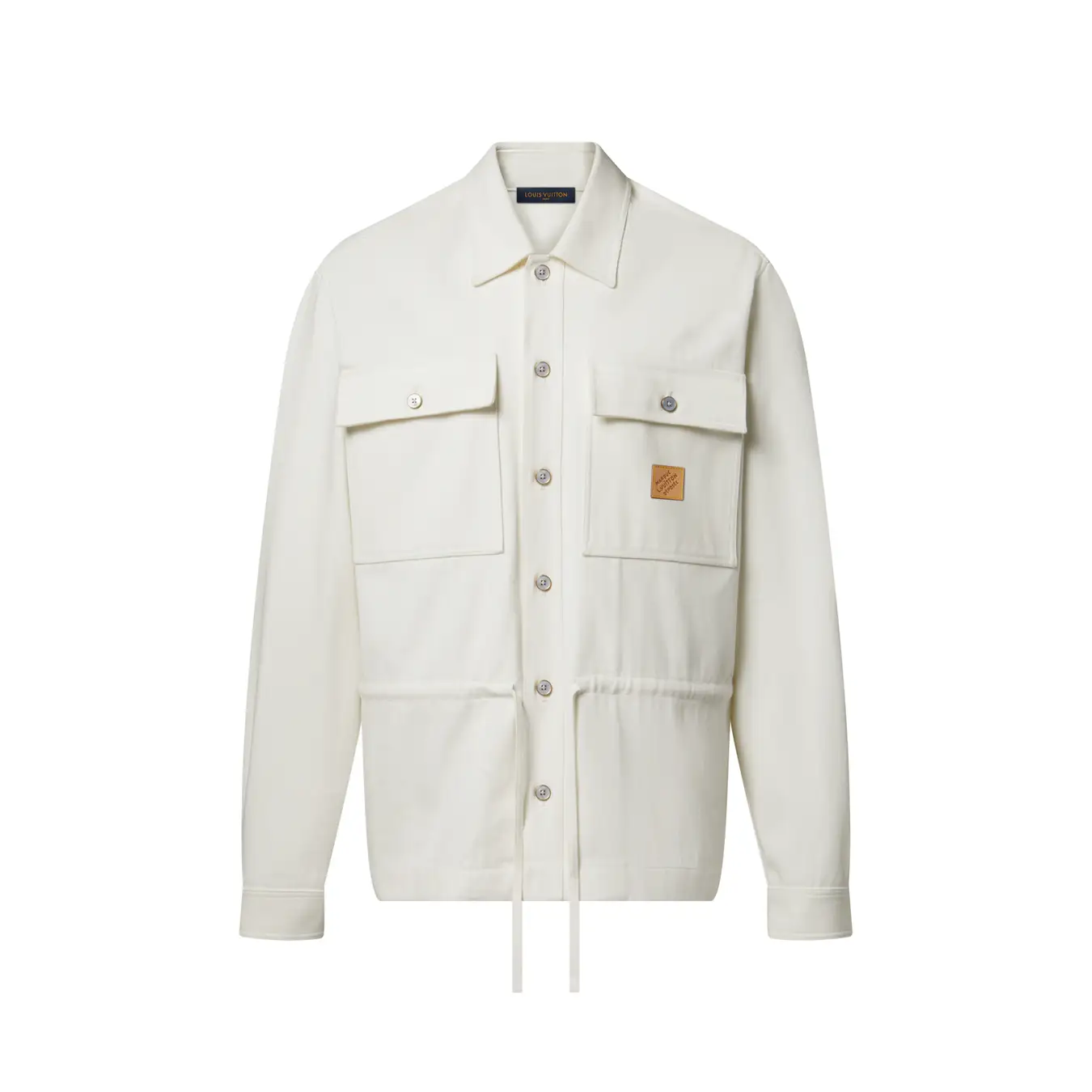 オーガニックコットンで仕立てたオーバーシャツ。2026春夏ファッションショーが提案するリラックス感溢れるエレガンスを表現した一着です。レイヤードスタイルが楽しめる多用途なデザインで、淡いグレージュの同系色のジャカード織りで仕上げたシェブロン·モチーフが特徴。胸元にはフラップ付きポケットを、ウエストにはドローストリングをあしらいました。ヌメ革のシグネチャーパッチが左ポケットを彩り、背面のプリントで施された「Vuitton」のシグネチャーがグラフィカルな印象をプラス。