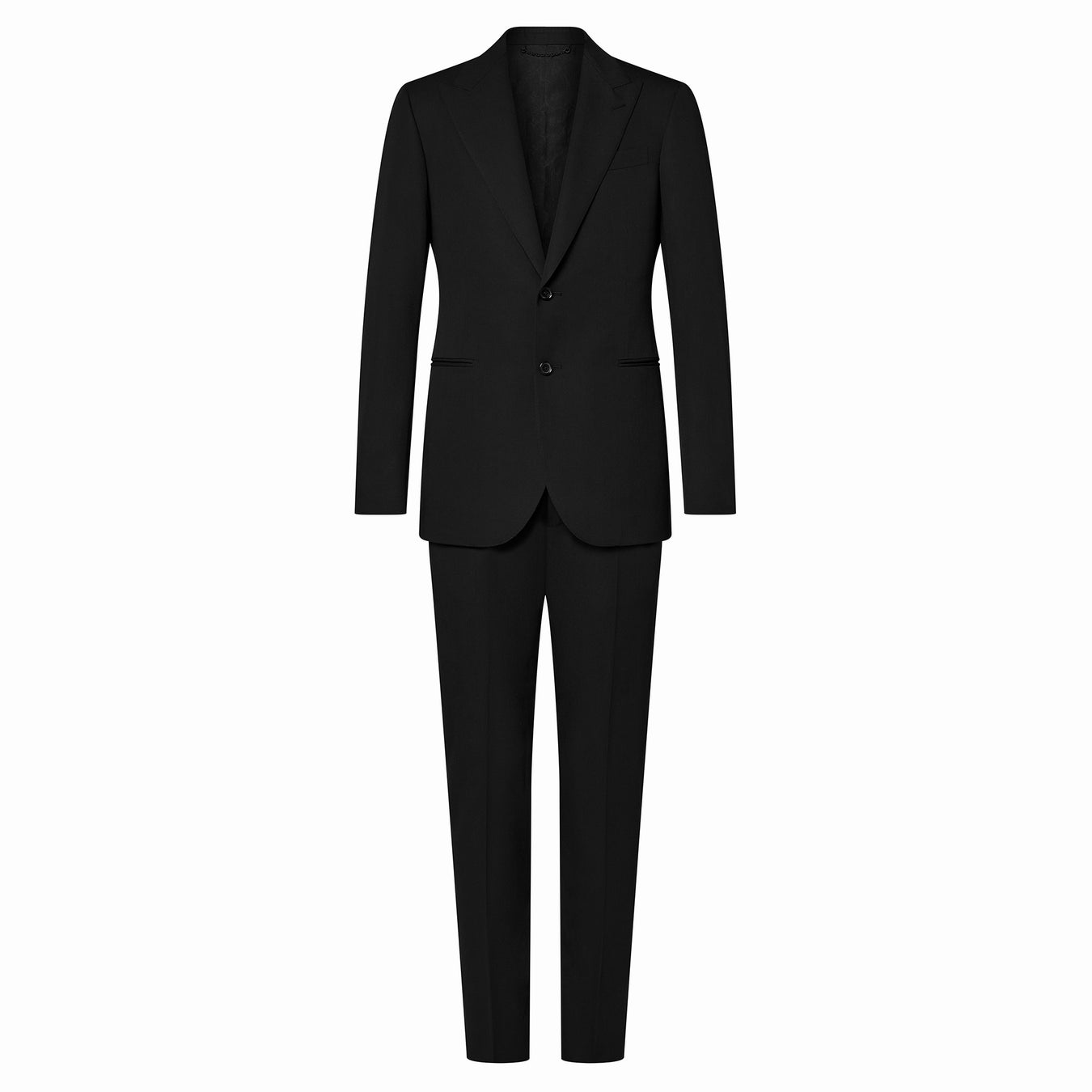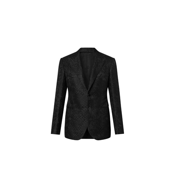 ウール & シルク混紡のラグジュアリーな生地が上品な光沢を放つ、ベーシックなブラックスーツ。ピークラペルとパイピングポケットが特徴のジャケットに、テーパードカットのシガレットパンツを合わせ、シャープなシルエットに仕上げました。ジャケットのトップボタンを彩るLV ステッチや、モノグラム・パターンのライニングなど、さりげないディテールがメゾンの個性を伝えます。