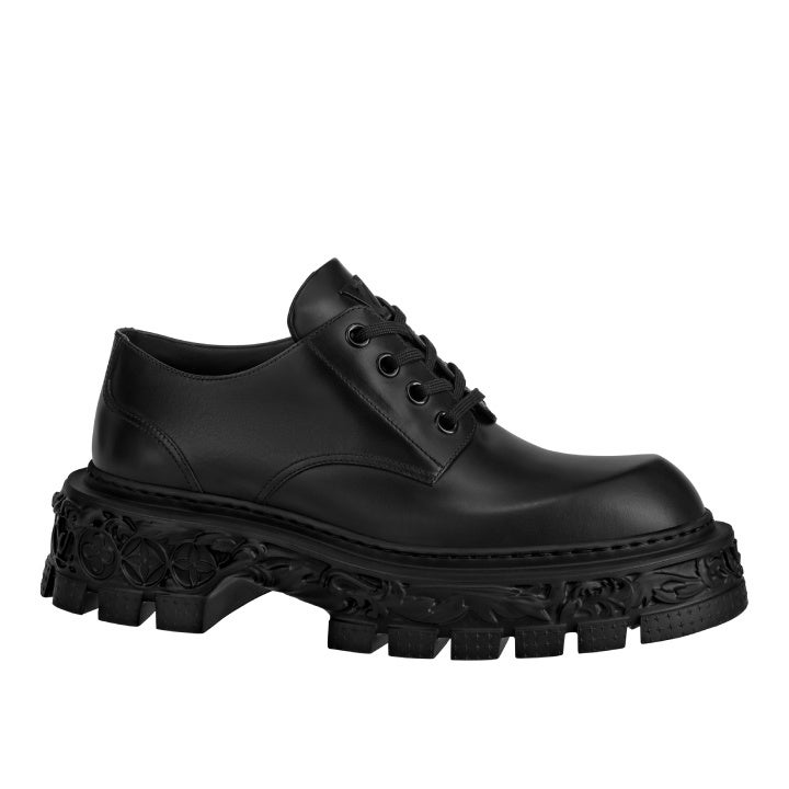 ハイブリッドなスタイルが魅力の「LV バロック・ライン ダービー」。アッパーには艶やかなカーフレザーを使用しました。チャンキーなラバーアウトソールに刻印したモノグラム・フラワー モチーフとLV イニシャルが精緻な立体感を生み出します。目を引くトレッド入りのソールにも、モノグラム・フラワー モチーフをあしらわれています。