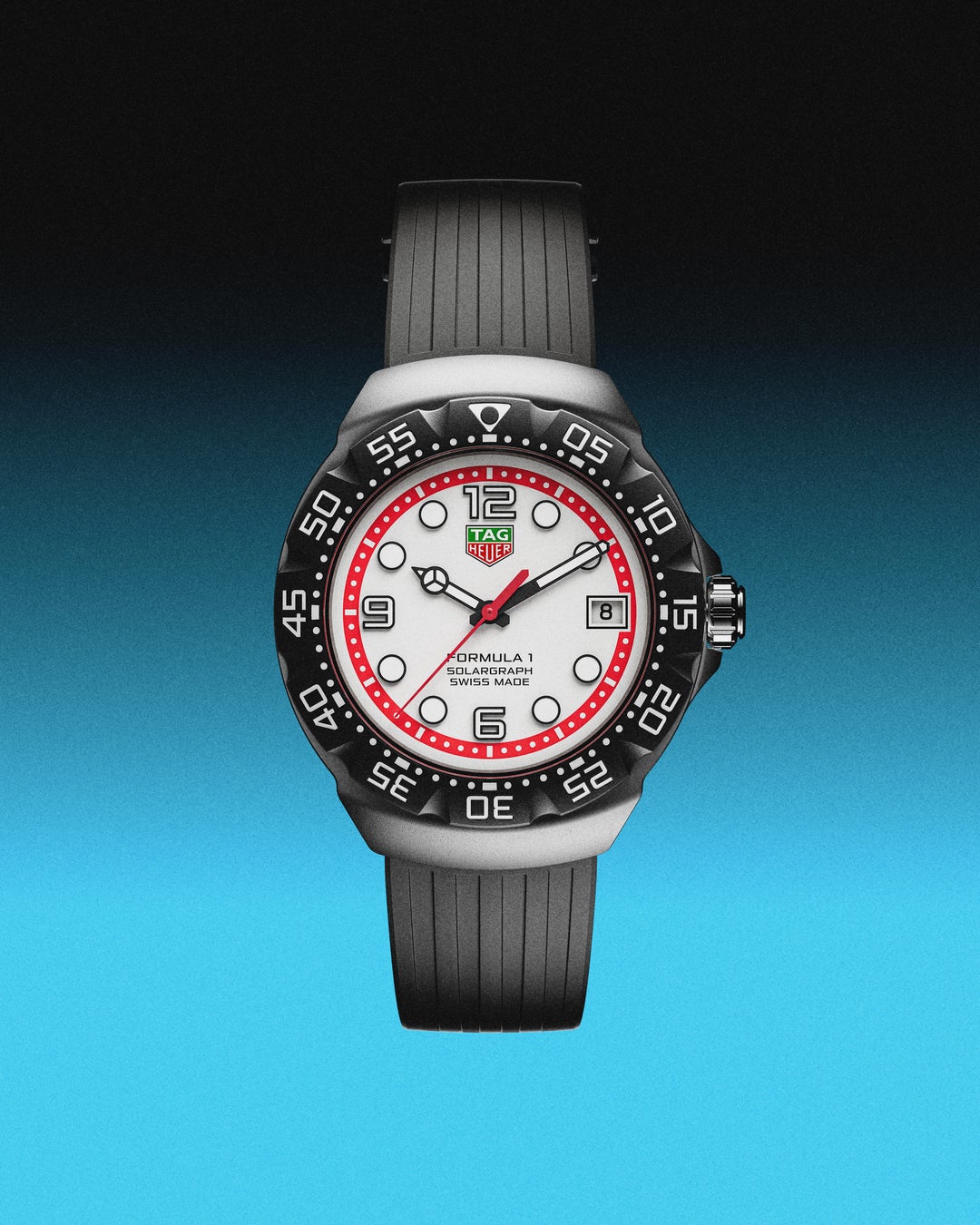 この新作のDLCコーティングとサンドブラスト仕上げを施したステンレススティール製ケースやTHポリライト製ケースの心臓部には、「タグ・ホイヤー フォーミュラ1」コレクション初となる“ソーラーグラフ”ムーブメントが搭載されています。タグ・ホイヤーが開発したこのムーブメントは、無限のエネルギー源である太陽を利用することで知られ、多くのメリットをもたらすことを約束しています。