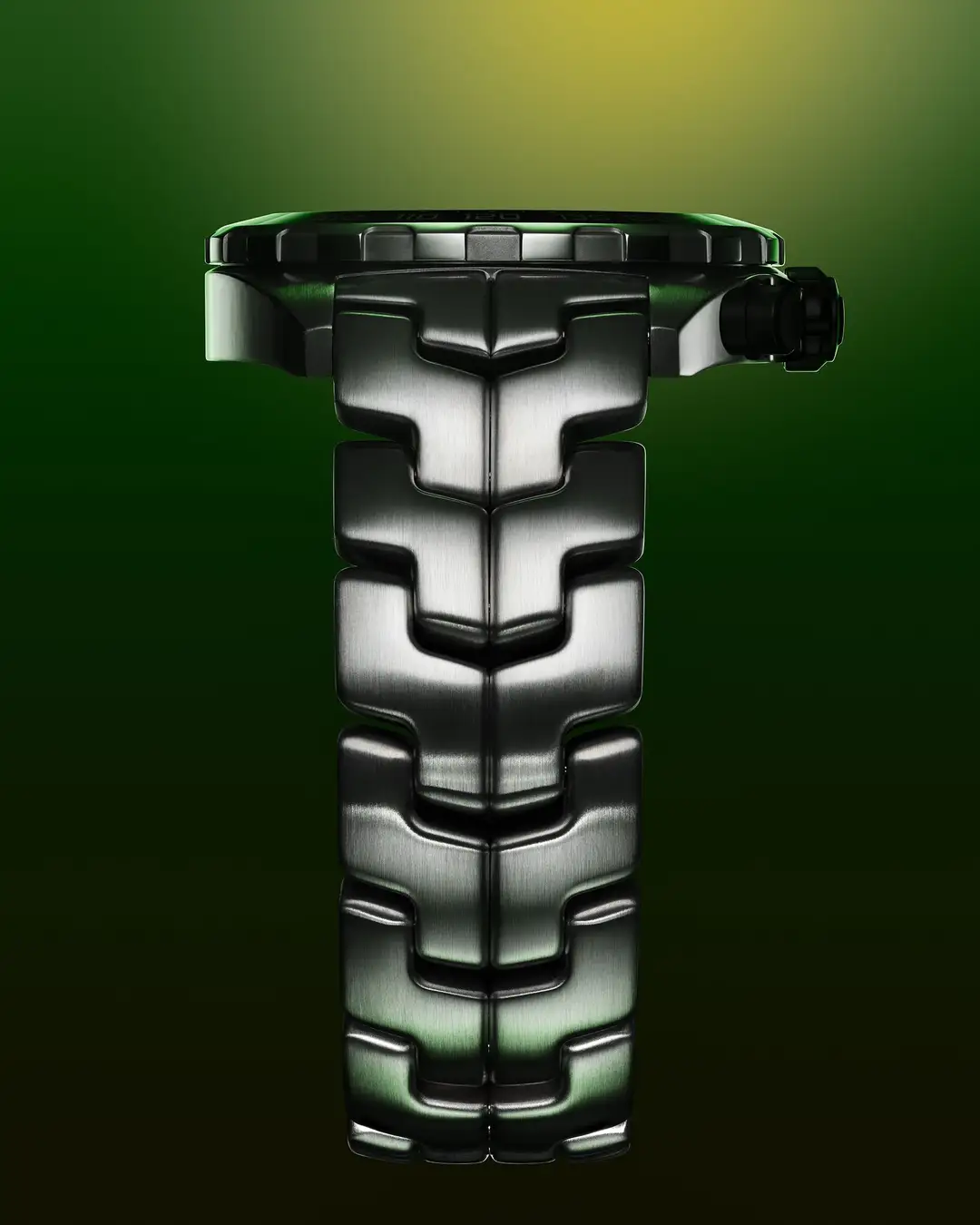 「タグ・ホイヤー フォーミュラ1 クロノグラフ x セナ 43 mm」は、堅牢なクォーツムーブメントを搭載し、セナが愛用したアイコニックなS/elブレスレットを再解釈しています。人間工学に基づいた快適性とスポーツエレガンスを兼ね備え、その流れるように連結したステンレススティール製のリンクが、セナのレース時代を特徴づけたスタイルを視覚的に想起させます。