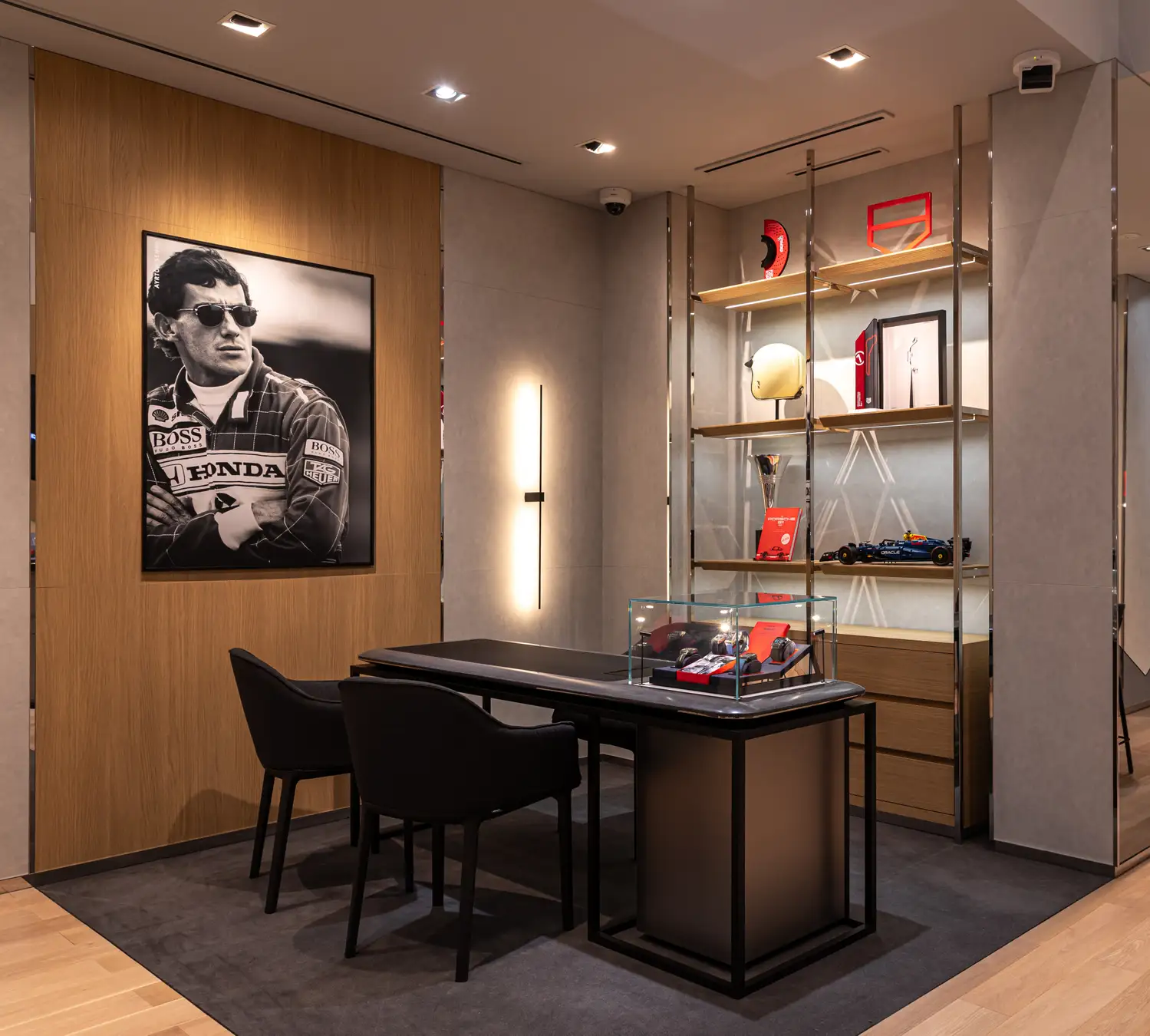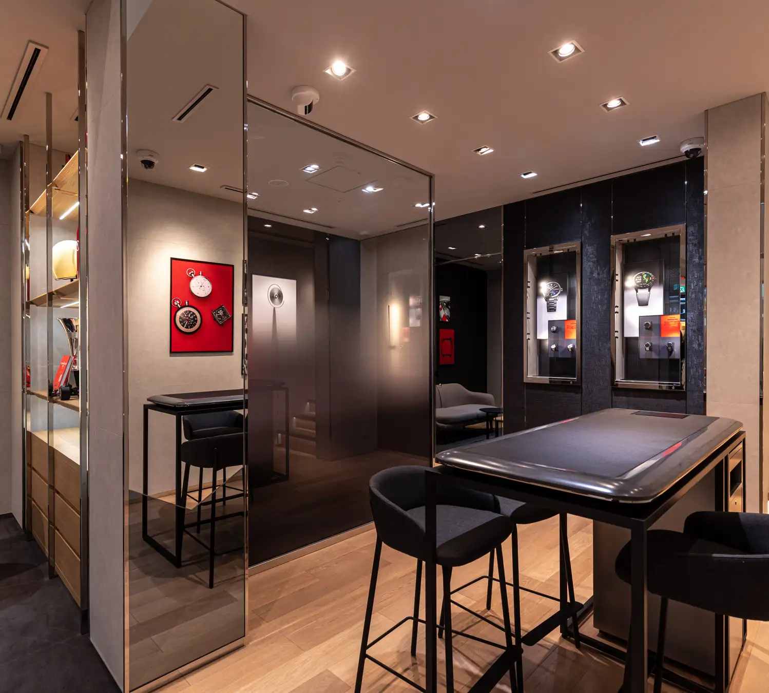 店内は、力強くタイムレスなブラックに加え、温かみのあるグレーやニュートラルカラーで構成され、新たな調和を生み出すことで、タイムピースをより引き立てています。また、洗練されつつも温かみのある空間設計により、タグ・ホイヤーの現代的な力強さと優雅さを反映しつつ、お客様に心地よくお過ごしいただける空間を提供します。