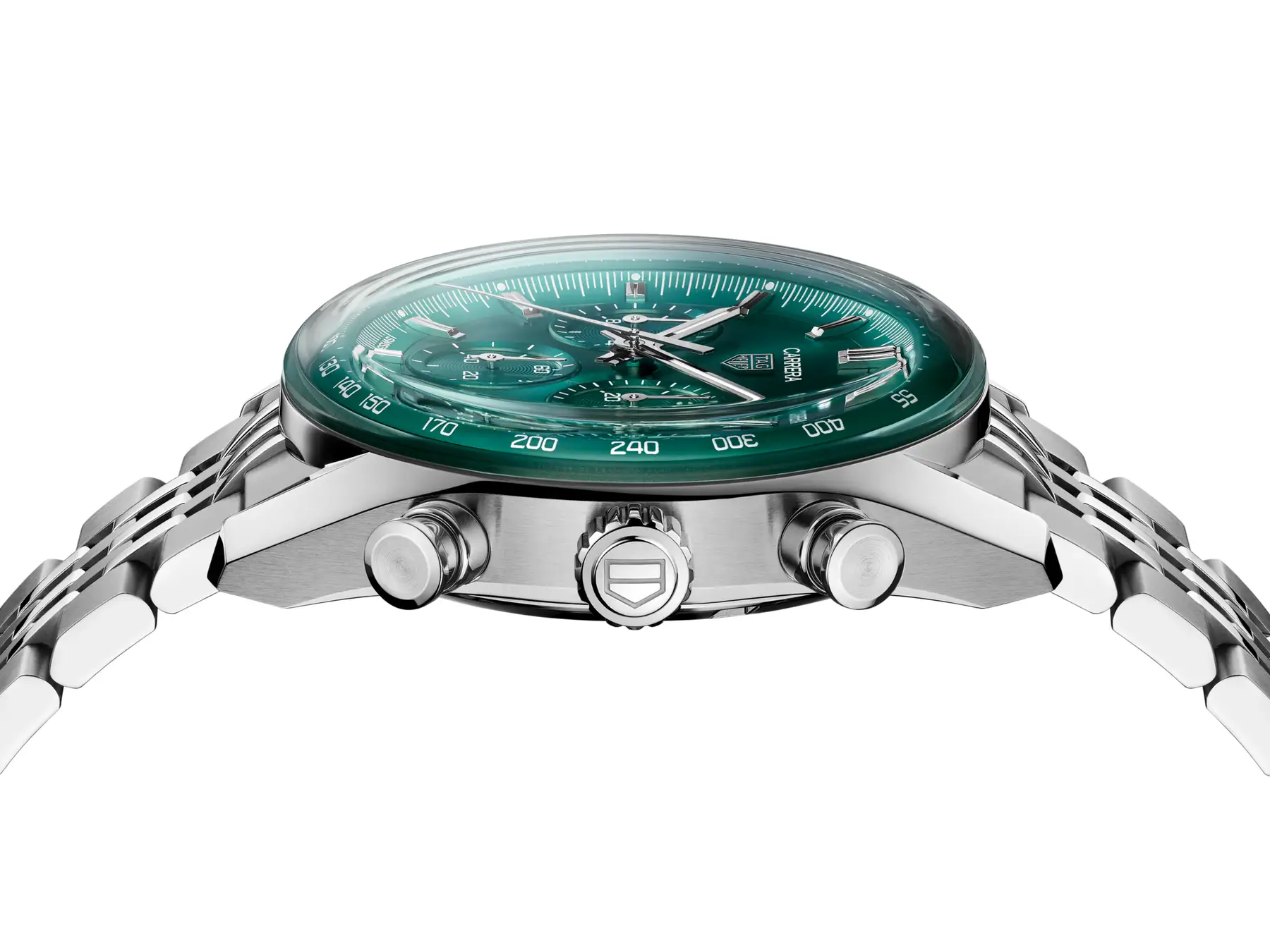 次に、新鮮さと普遍的な美しさが調和するティールグリーンダイヤルのモデルは、タグ・ホイヤーの新たなシグネチャーカラーとなる深みのある色合いが特徴です。同系色のカウンターとロジウムコーティングを施した針を配したダイヤルは、光の当たり方によって表情を変え、腕の動きに合わせて繊細な色のニュアンスを生み出します。これにより、タグ・ホイヤーが重視する視認性と視覚的な調和が、一層際立っています。