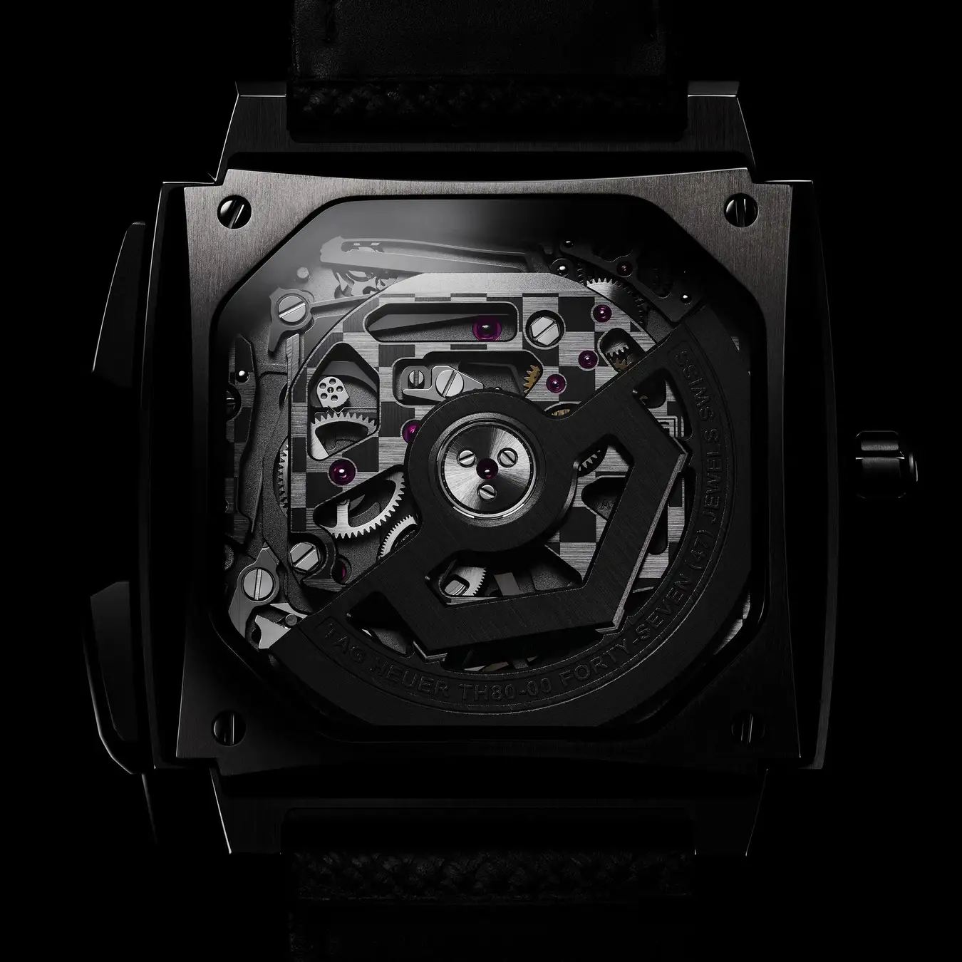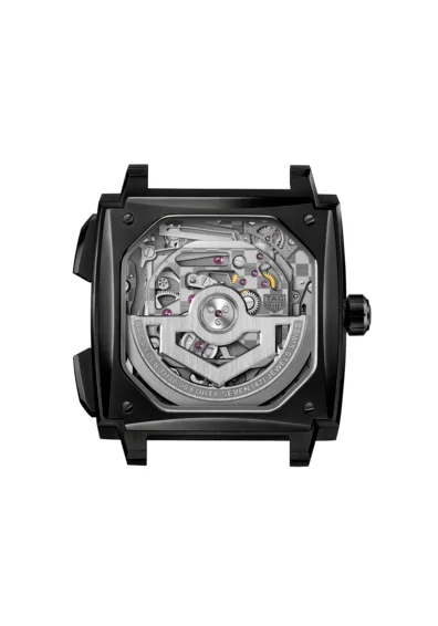 スプリットセコンド用のTH81-00で確立された設計思想を継承しつつ、シールド型ローターを採用。ムーブメントの背面にはタグ・ホイヤーのシグネチャーであるチェッカーフラッグ仕上げが施されています。