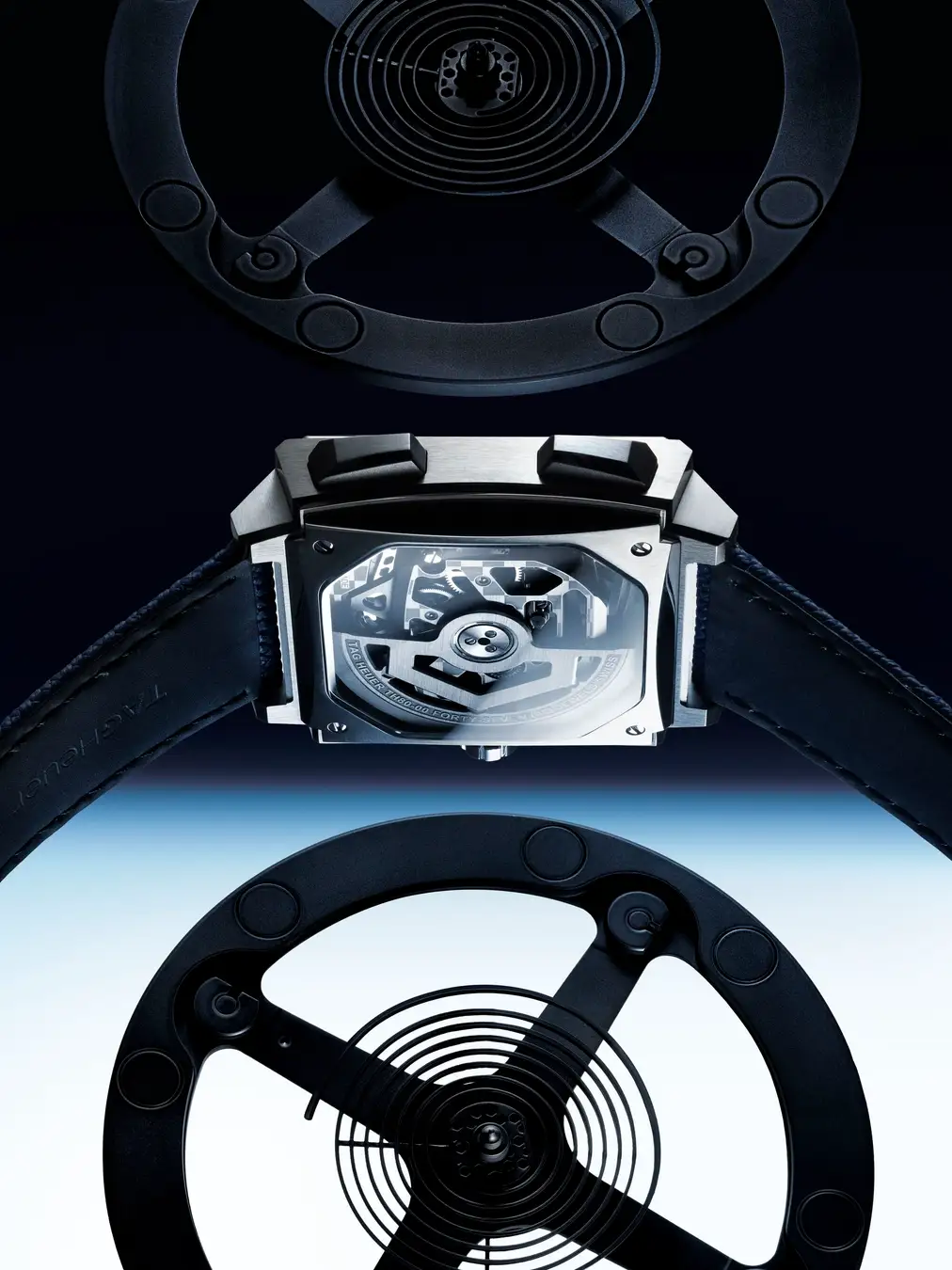 タグ・ホイヤーが主導し、ヴォーシェ・マニュファクチュール・フルリエとのパートナーシップのもとで開発された「TH80-00」は、タグ・ホイヤーラボが生み出した画期的なコンプライアント クロノグラフ機構を核としています。オープンワーク構造に加え、反転構造を採用したことで、香箱、輪列、TH-カーボンスプリングを採用したテンプと脱進機がダイヤル側からはっきりと見えるようになりました。また、新たに考案された自動巻システムにより、このムーブメントをオートオルロジュリー仕様へと格上げしています。
