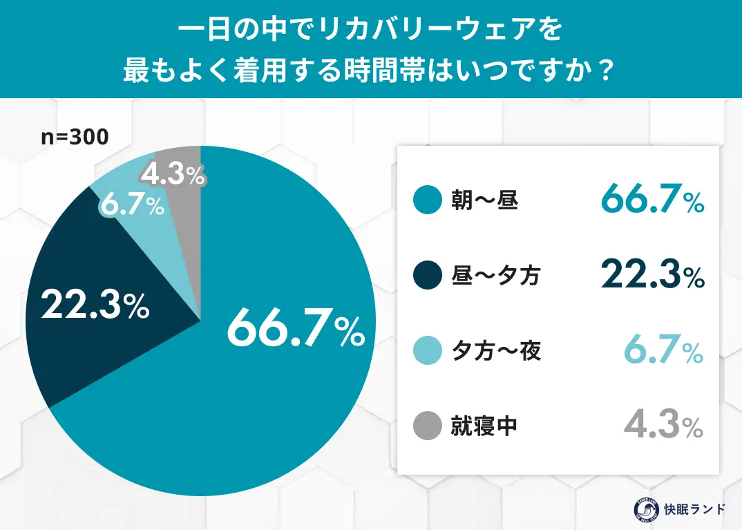 → 着用時間帯は就寝中が中心となっており、リカバリーウェアが主に夜間のケア用途として利用されている実態がうかがえます。