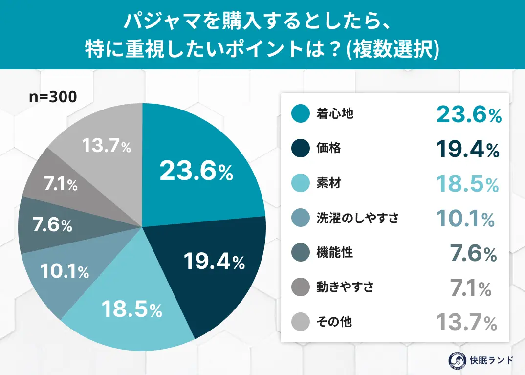 パジャマの購入時に重視されるポイントは「着心地」「素材」などの快適性が上位