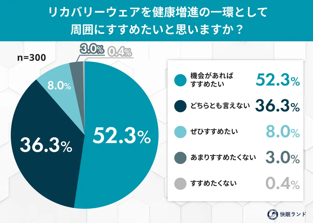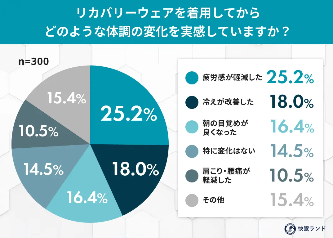 今回の調査結果から、リカバリーウェアは「着れば何かが大きく変わる」という期待よりも、日々の体調を整えるための習慣的なアイテムとして受け止められている印象を受けました。着用後の変化について「変わらない」と回答した人が多数派である点は、リカバリーウェアが即効性をうたうものではなくことを示しています。一方で、疲労感や冷え、睡眠といった基礎的なコンディション面に変化を感じている声もあり、継続して着用することで病気に打ち勝つ体質づくりにつながることでしょう。快眠ランドでは今後も、日常生活の中で取り入れやすい体調管理のヒントや情報を、分かりやすく発信してまいります。