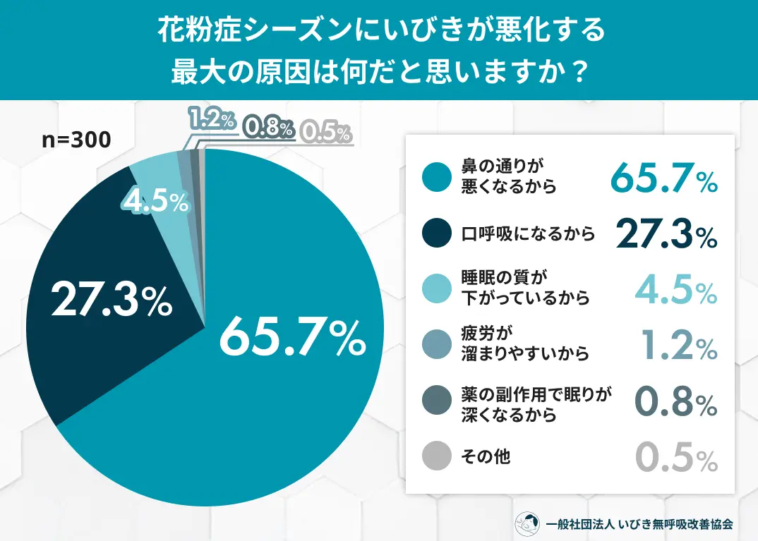 悪化の原因は「鼻の通り(65.7%)」と「口呼吸(27.3%)」が圧倒的。鼻トラブルが直接の原因に