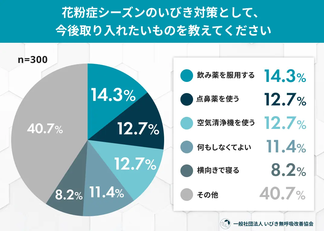 その他:40.7%(鼻腔拡張テープを使う:8.1%、鼻うがいをする:7.7%、加湿器を使う:7.7% など)