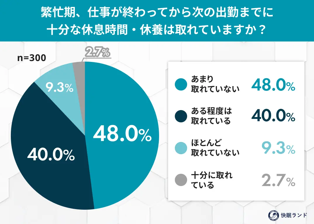 → 「あまり取れていない」(48.0%)と「ほとんど取れていない」(9.3%)を合わせると、繁忙期に約6割(57.3%)が勤務間の休息不足を感じています。これは、2019年から努力義務化されている「勤務間インターバル制度」の趣旨がまだ十分に浸透していない現状を示唆しています。