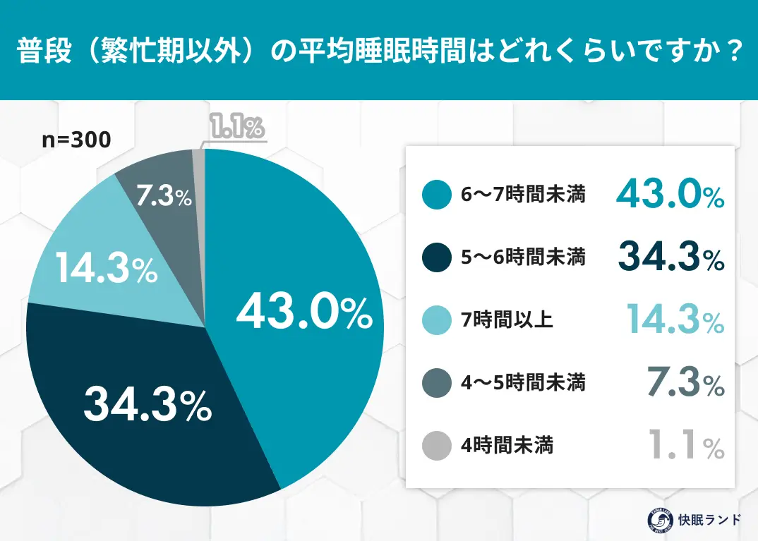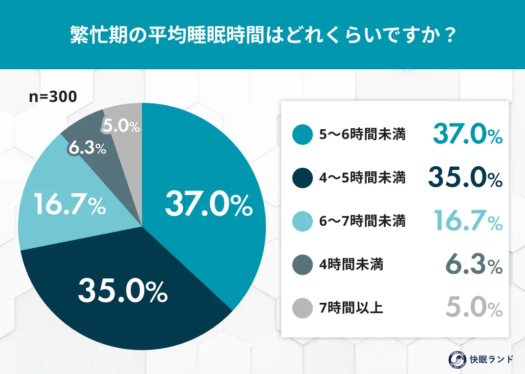 普段の平均睡眠時間は「6〜7時間未満」が最多(43.0%)だが、繁忙期は「5〜6時間未満」(37.0%)・「4〜5時間未満」(35.0%)に集中