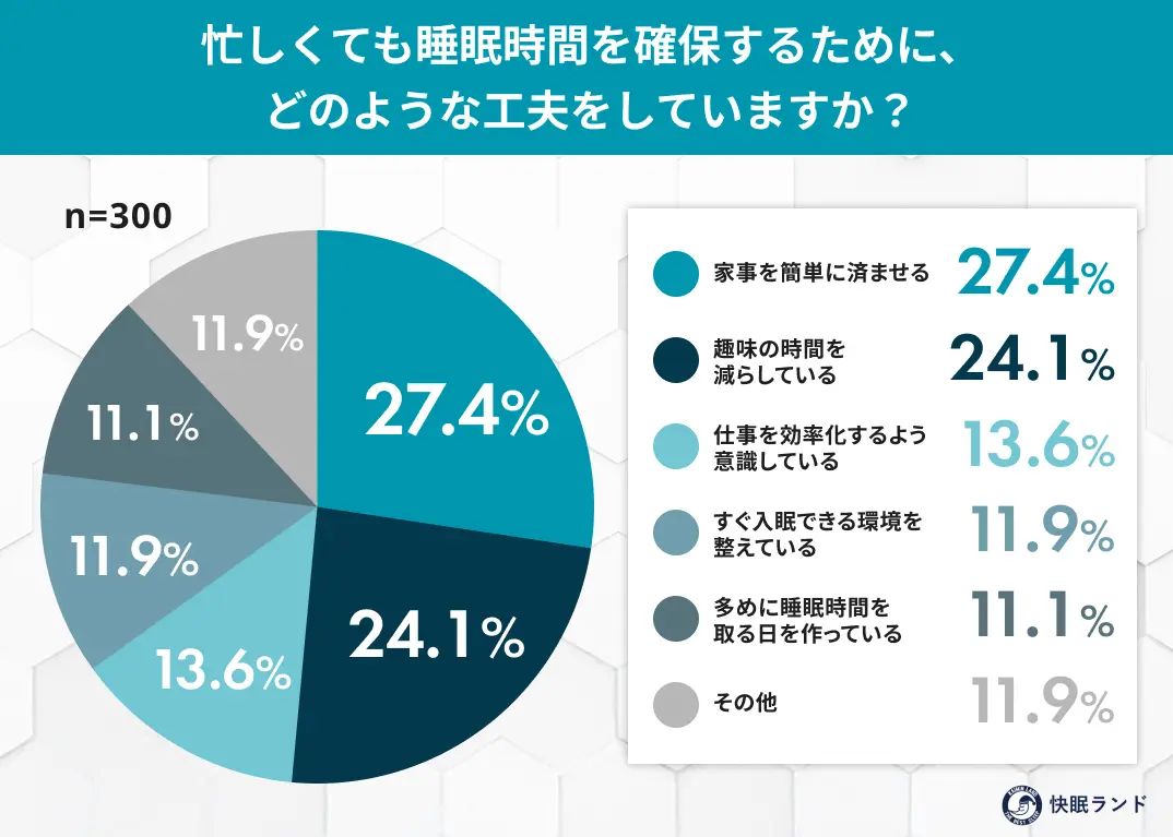 睡眠確保の工夫は「家事を簡単に済ませる」(27.4%)が最多。趣味や娯楽の時間を削って睡眠を守る傾向も