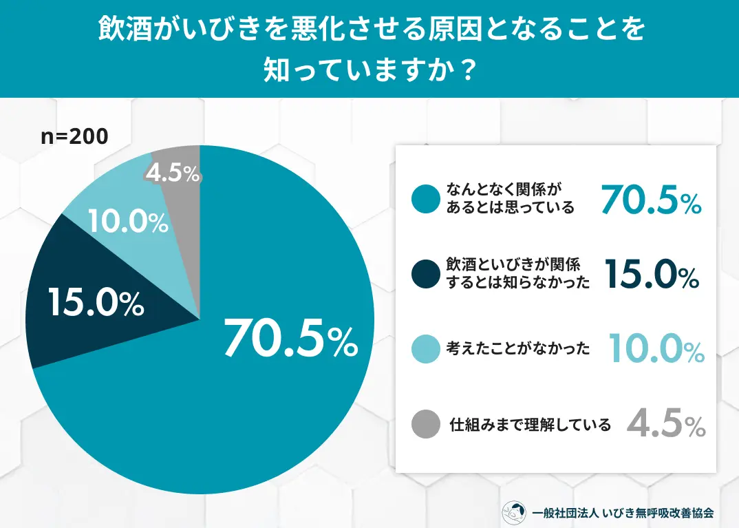 3月から4月にかけて、職場やプライベートでの歓送迎会が増えるシーズンが到来します。楽しいお酒の席の翌朝、「昨日のいびき、すごかったよ」と指摘され、気まずい思いをした経験はないでしょうか。一般社団法人 いびき無呼吸改善協会は、20代〜60代の飲酒習慣がある男女200名を対象に「飲酒といびきに関する実態調査2026」を実施しました。その結果、半数以上の人が飲酒後のいびき悪化を自覚している一方で、その仕組みを正しく理解している人はわずか4.5%にとどまるという、深刻な「知識の乖離」が浮き彫りになりました。