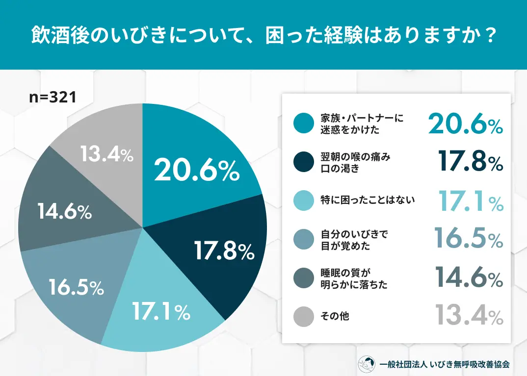 • 飲酒後のいびき悪化: 半数以上(53.5%)が、飲酒した夜にいびきが「ひどくなる」と自覚・指摘