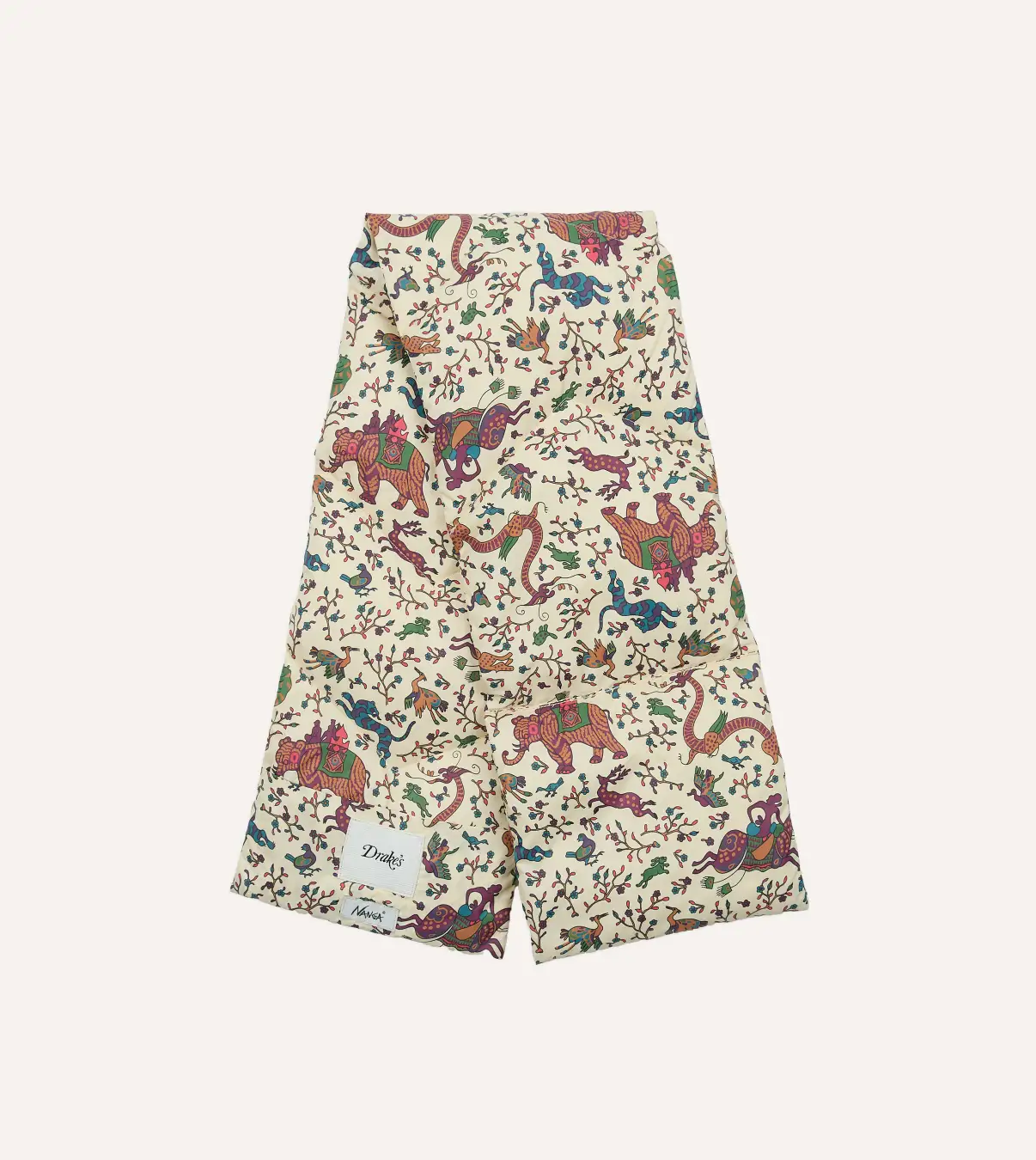 ナンガのポータブルライトダウンマフラーをベースに、ドレイクスのネクタイやチーフを想起させるデザインを落とし込んだキルテッドスカーフ。