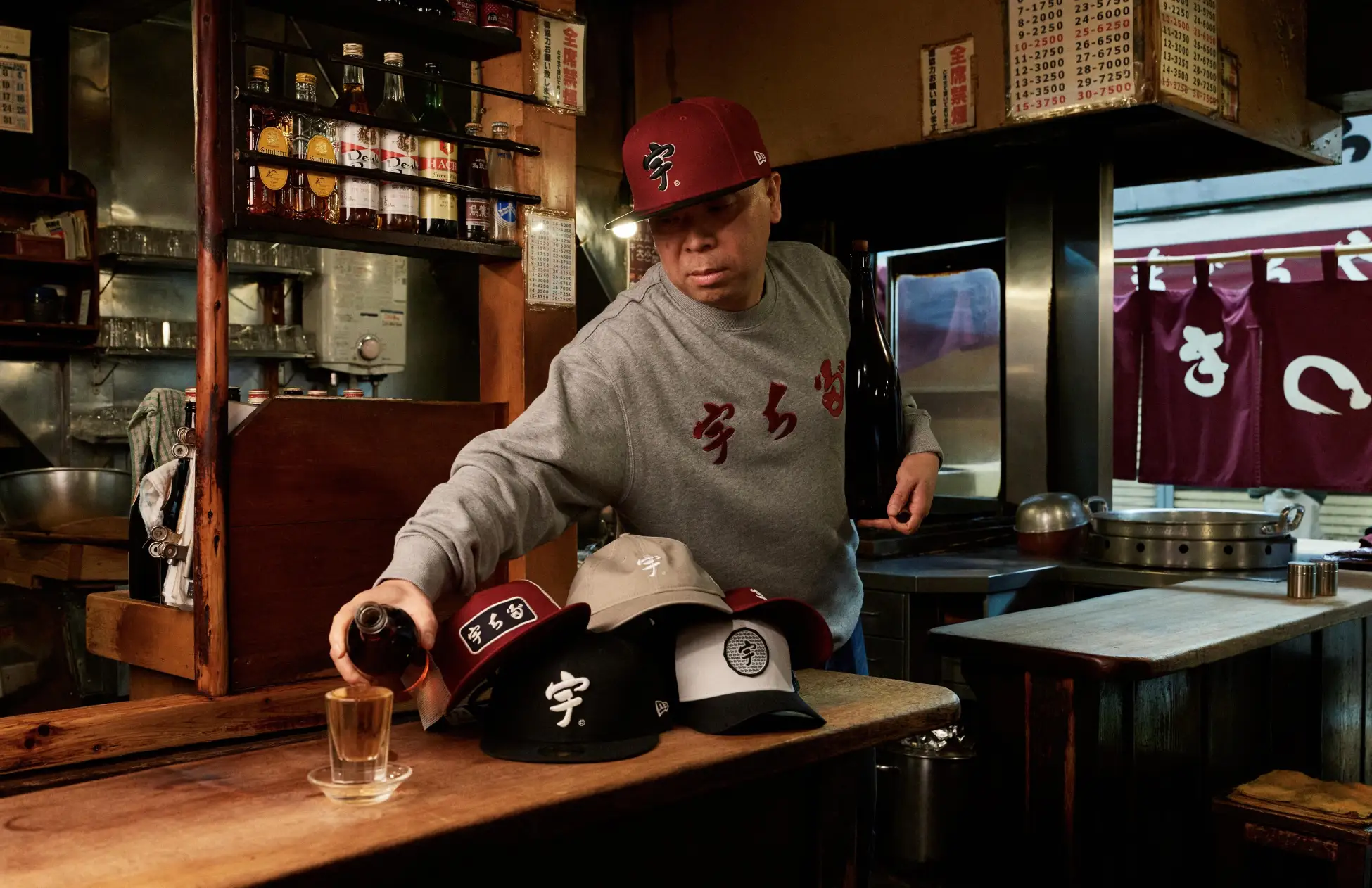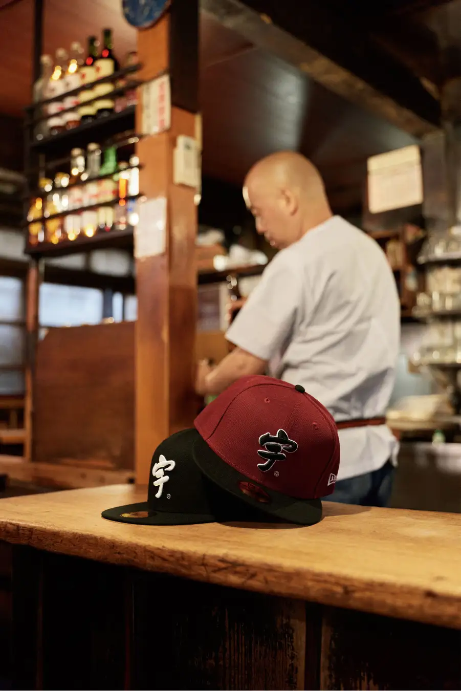 今回のコラボレーションでは、そんな「宇ち多゛」の世界観をファッションとカルチャーが融合したデザインで表現。[59FIFTY®]をはじめとするヘッドウェアやアパレル計13アイテムを通じて、半世紀を超えて人々に愛されてきた名店の雰囲気を、ニューエラならではのデザインで仕上げたコレクションです。「宇ち多゛」の暖簾をイメージしたカラーリングを基調に、筆文字の風合いを生かしたロゴや、“宇”の文字をフロントにあしらったデザインなど、名店の空気を感じさせるディテールを随所に組み込んでいます。