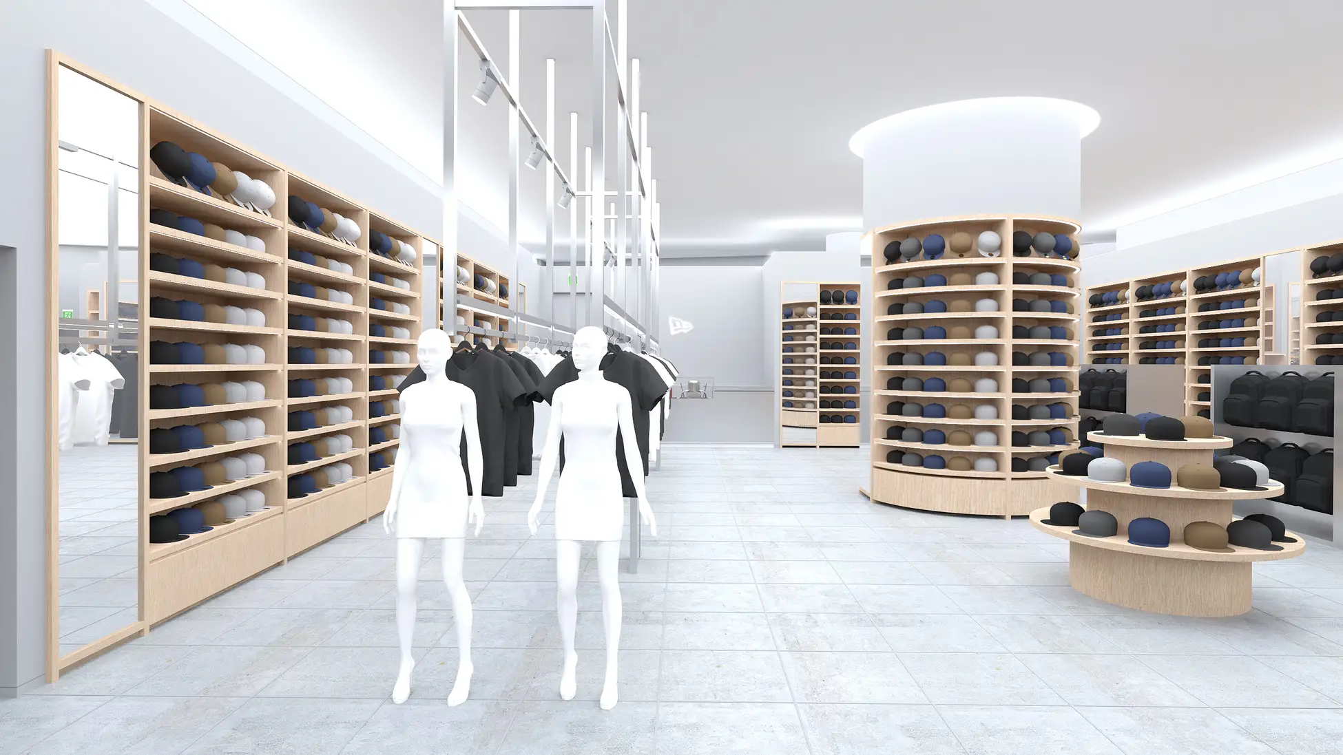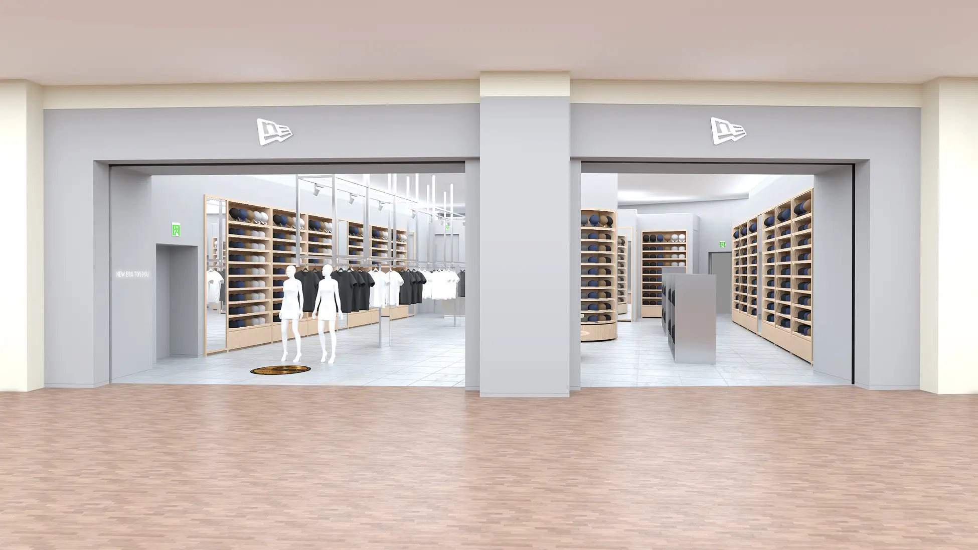 ニューエラ豊洲は、ショッピングモールの開放的な環境に寄り添いながら、ブランドの世界観を丁寧に織り込んだストアデザインを採用。木目調の棚とスチール什器を随所に配した店内は、明るく洗練された印象に仕上げています。中央には視認性の高い円柱型の棚を設け、連動したデザインの三段陳列棚とともに、最新コレクションやシーズンアイテムを展開します。