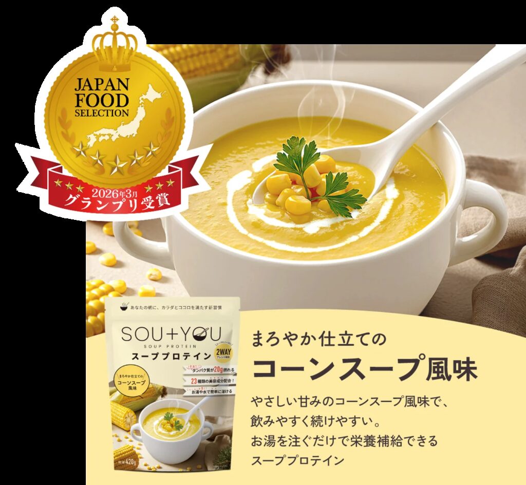 これから迎える暑い季節、食欲がない日でも続く。“スーププロテイン” という新習慣。SOU+YOU コーンスープ風味が「ジャパン・フード・セレクション」グランプリ受賞!!