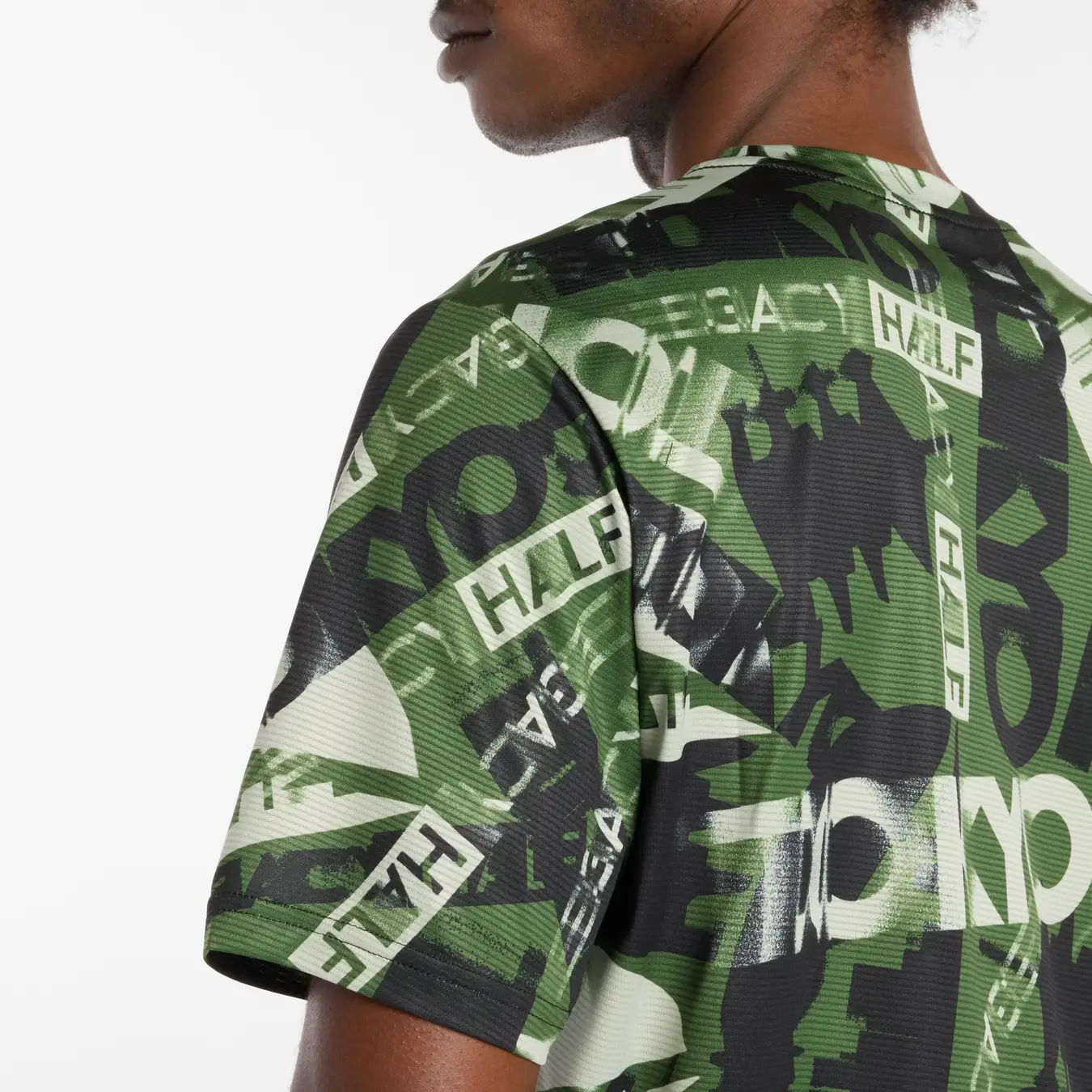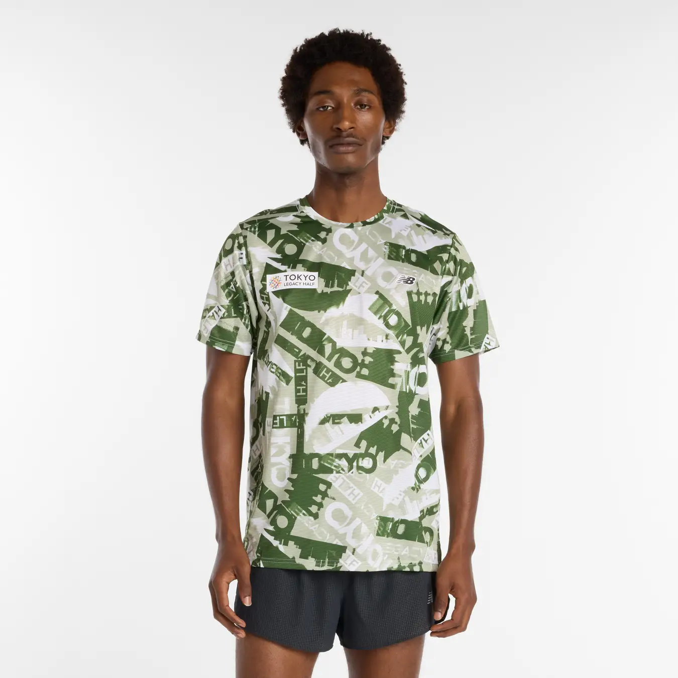 軽量で優れた吸汗速乾性と通気性を発揮するNB Dry搭載のボーダーメッシュ素材を使用。前後差のある着丈で、サイドのスリットが空気の流れをつくり、通気性を向上。東京の街をモチーフにしたオールオーバーグラフィックプリントと、右胸の東京レガシーハーフの大会ロゴがアクセント。左胸のNBフライングロゴは柄の中でも視認できるマットプリントで演出しています。