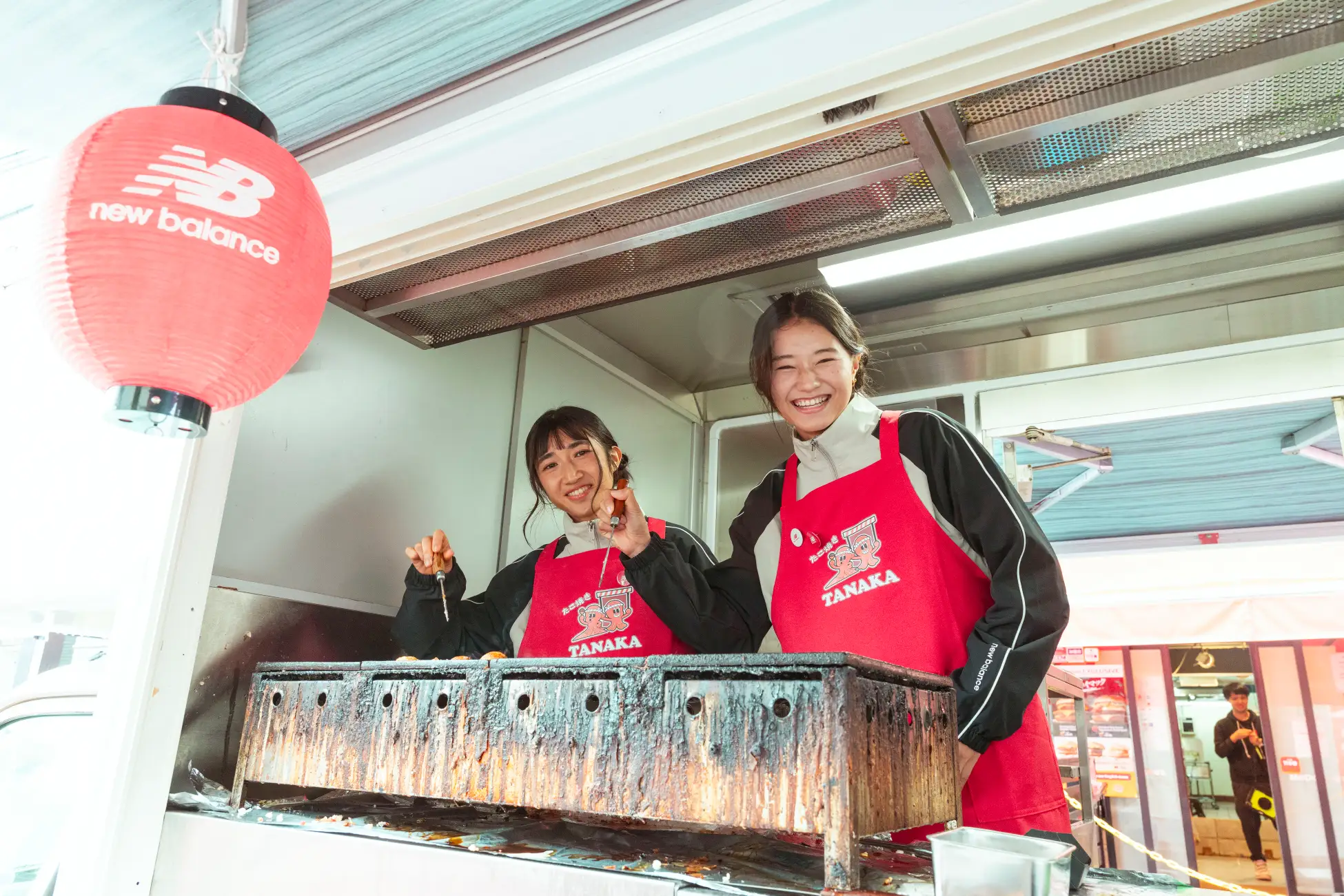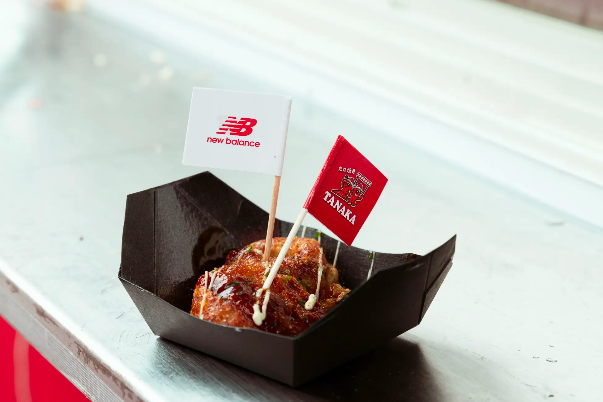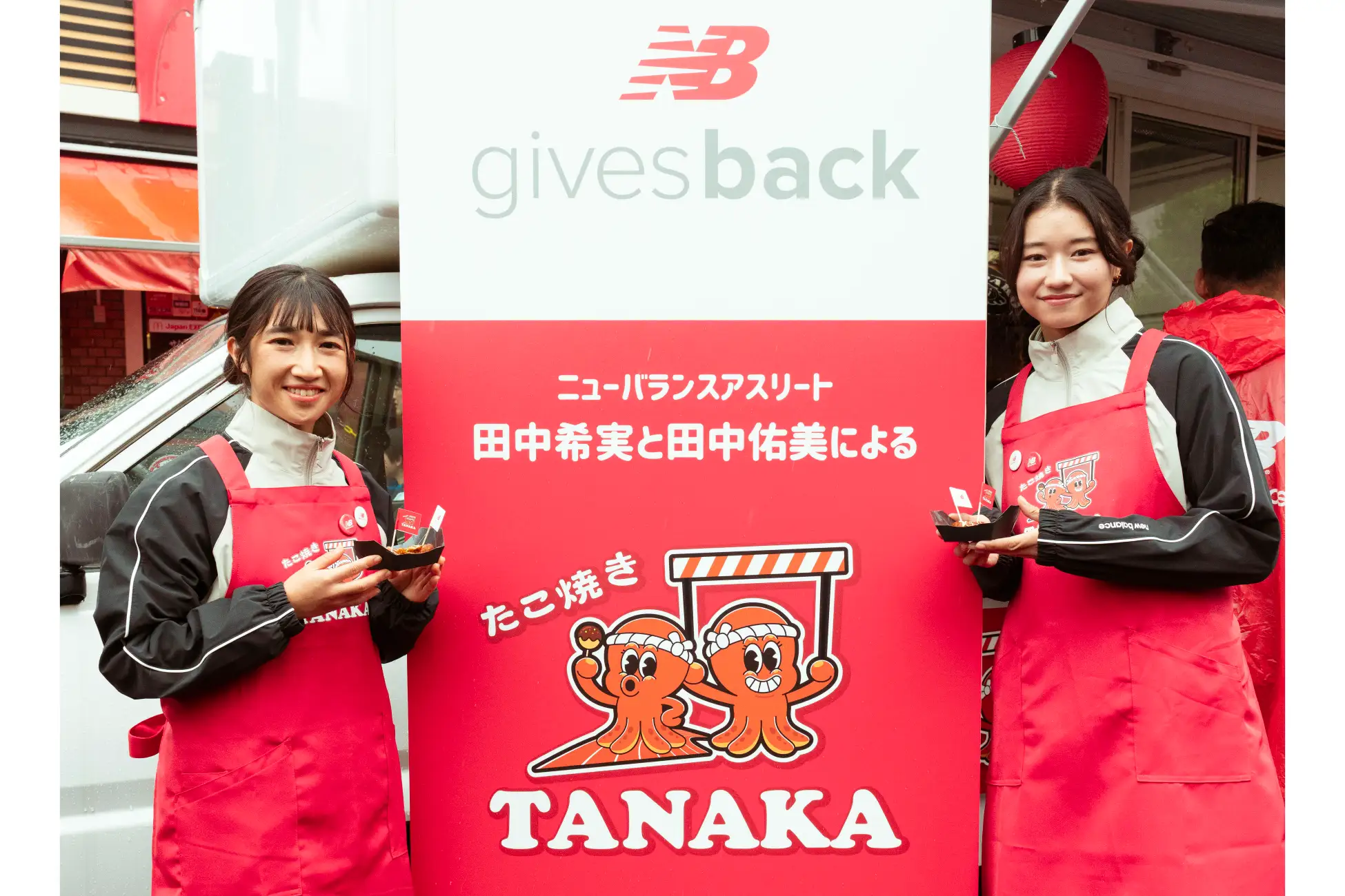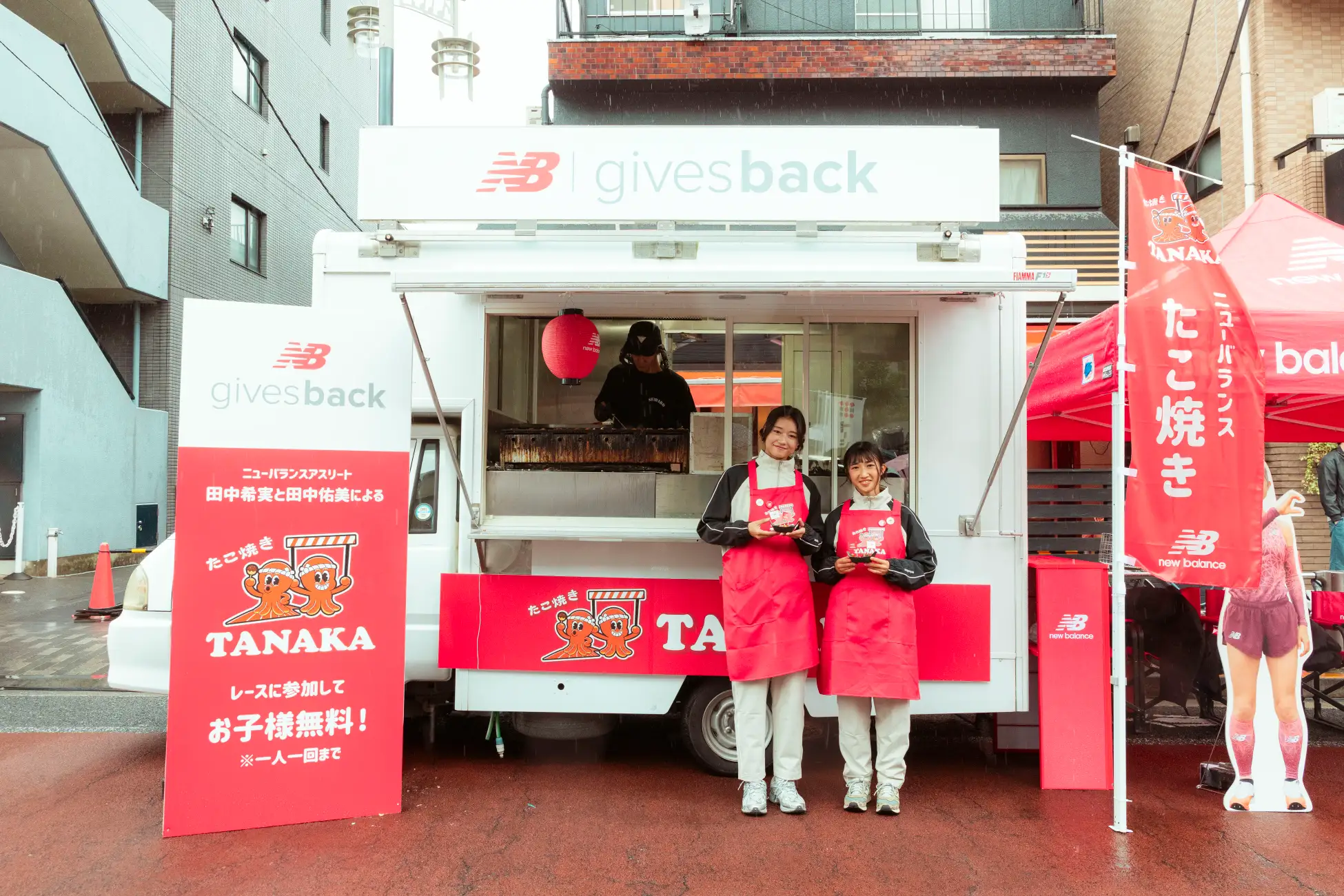 そしてニューバランスブースでは「たこ焼き田中」をオープン。両選手は「日ごろ皆様からの応援に励まされています。そんな感謝の気持ちをお返ししたいという想いからgives backの活動を行っています。これまでgives backの活動はランナーの皆さんへのプレゼントや、ランナーの方と一緒に走ってコミュニケーションを取る、という形で参加していましたが、もっと、心で繋がれるようなことをしたい、と話し合った結果、学園祭のようなほのぼのした雰囲気で皆さんと触れ合えればと思いました。2人とも関西出身ということでたこ焼きに決定し、2人とも田中なので“たこ焼き田中”という名前にしました。」とコメントし、日頃の選手活動への応援への感謝として、大会に参加したキッズ・ジュニアランナーの皆さんへたこ焼きをふるまいました。