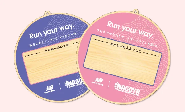 来店された名古屋ウィメンズマラソン出走の方がご自身の目標や想いを絵馬に記入し、その絵馬を大会当日にがんばった自分が受け取ることができるサービス。目標タイムでも、完走の誓いでも、家族への感謝でも。言葉にすることで、覚悟はより強くなる。スタートラインに立つ自分を後押しする体験を。