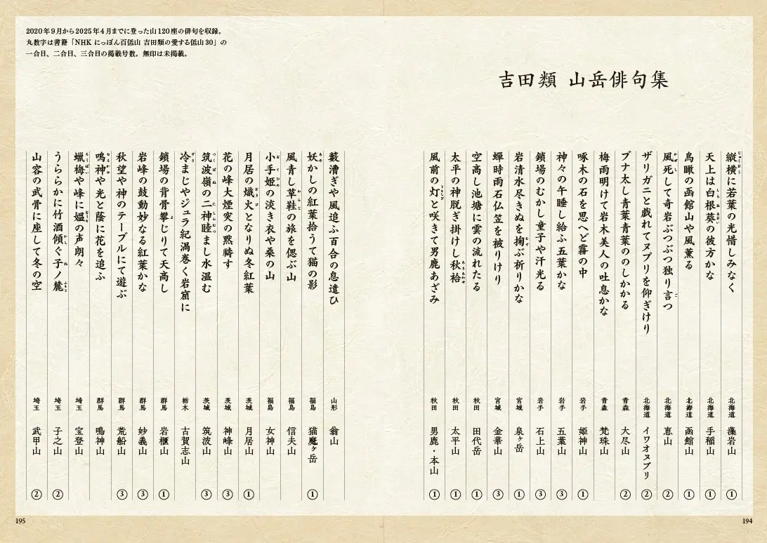 先日文化勲章受章が決定した小松和彦さん(民俗学者)との特別対談のほか、これまで類さんが番組で詠んできた俳句を集めた「吉田類 山岳俳句集」も収載! 付録として、これまでの全100座を掲載したマップも収録。読むだけでも楽しめる画期的登山ガイド第3弾。