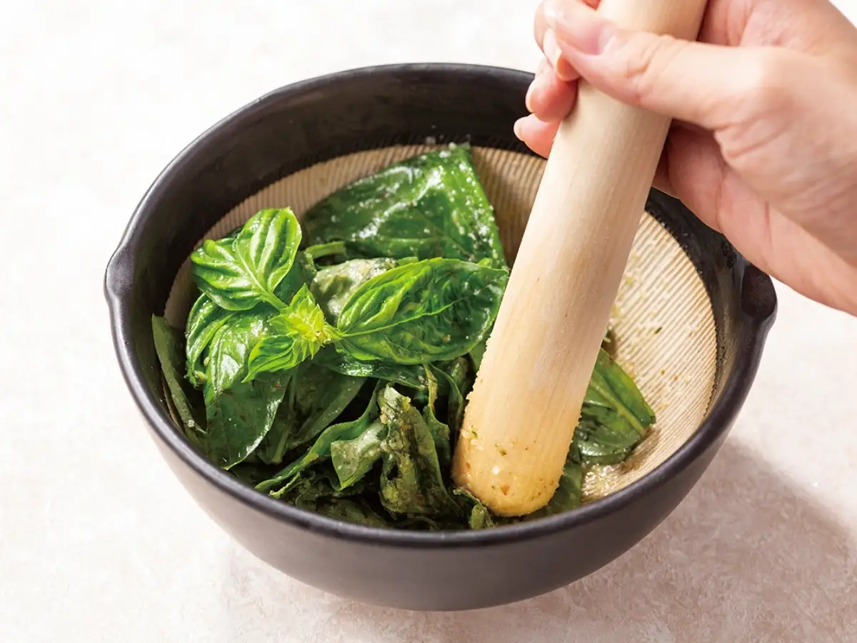 特にジェノベーゼパスタはお客様自身でバジルソースを作る体験ができる特別な一品。