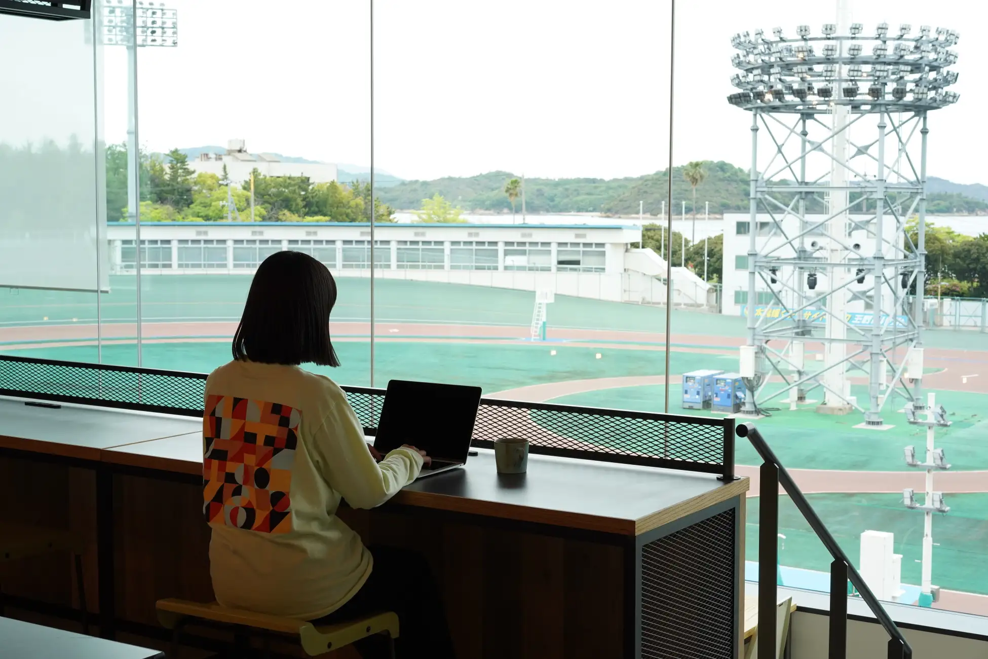 チェックイン後は、競輪場と瀬戸内海を望むラウンジへ。作業や読書をしながら、移動で高まった気持ちを静かに整えます。