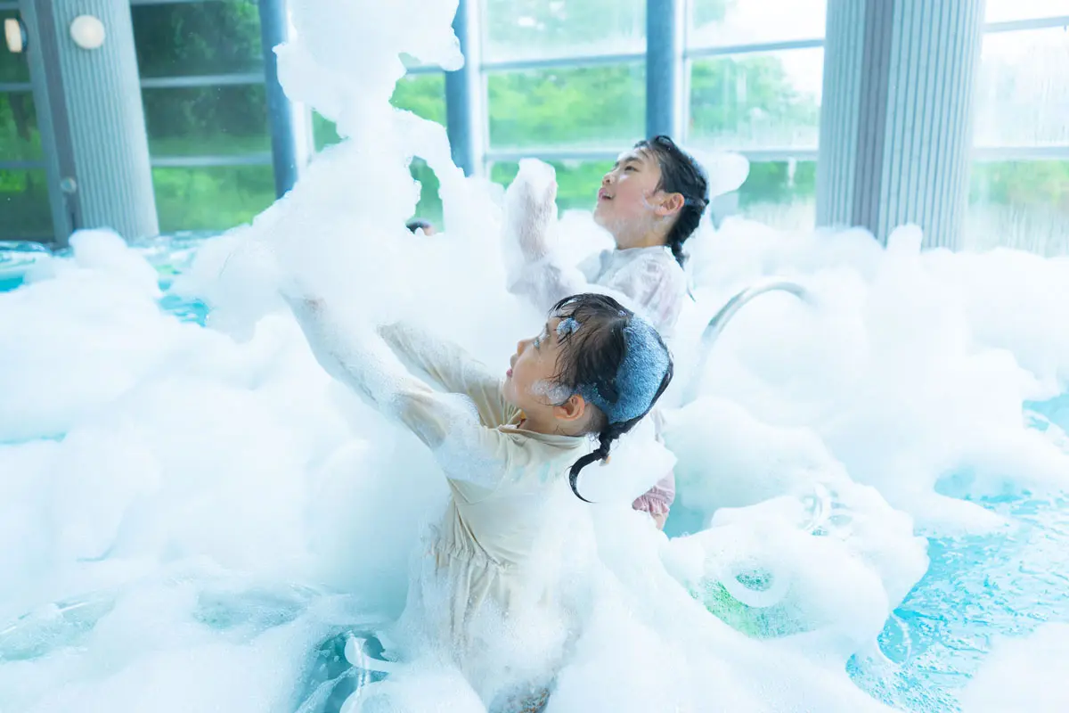 水着で入れるお風呂エリアで行う、大量の泡が噴き出すイベント。お風呂が泡で包まれて、まるで泡のプールのよう! お子さまはもちろん大人も一緒に楽しめる人気コンテンツです。泡に包まれながら写真を撮ったり、特別な時間をお楽しみいただけます。