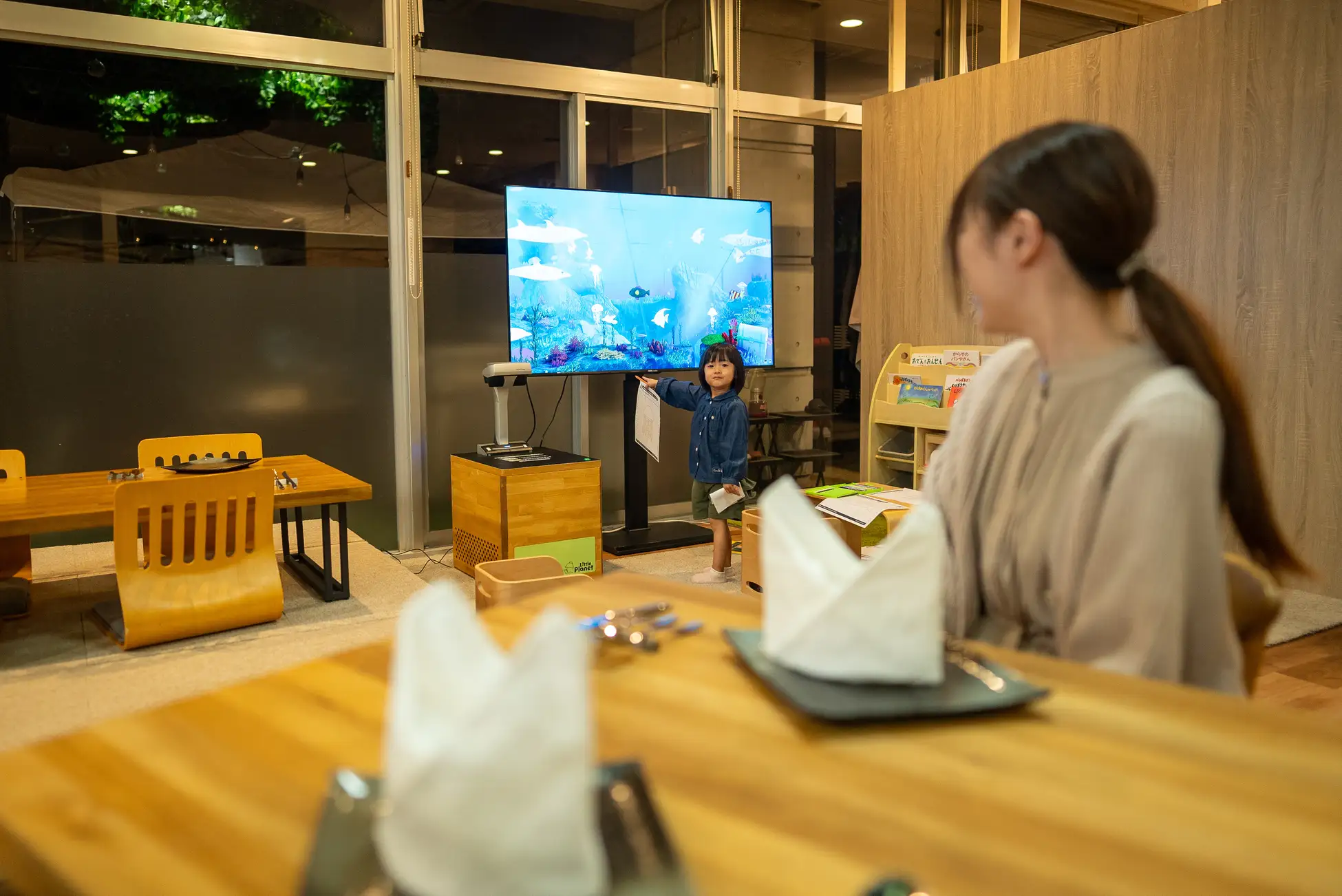 本館内の「おやさいダイニング レストランMORINIWA」は、埼玉県産の食材やヨーロッパ野菜を使用した料理を提供しています。里山の自然に囲まれた落ち着いた空間で、家族での食事や日帰りレジャーのランチ利用にもおすすめです。キッズメニューやレストラン内にデジタルコンテンツ「リトルプラネット」をご用意、小さなお子さま連れのご家族もゆったりとお食事をお楽しみいただけます。