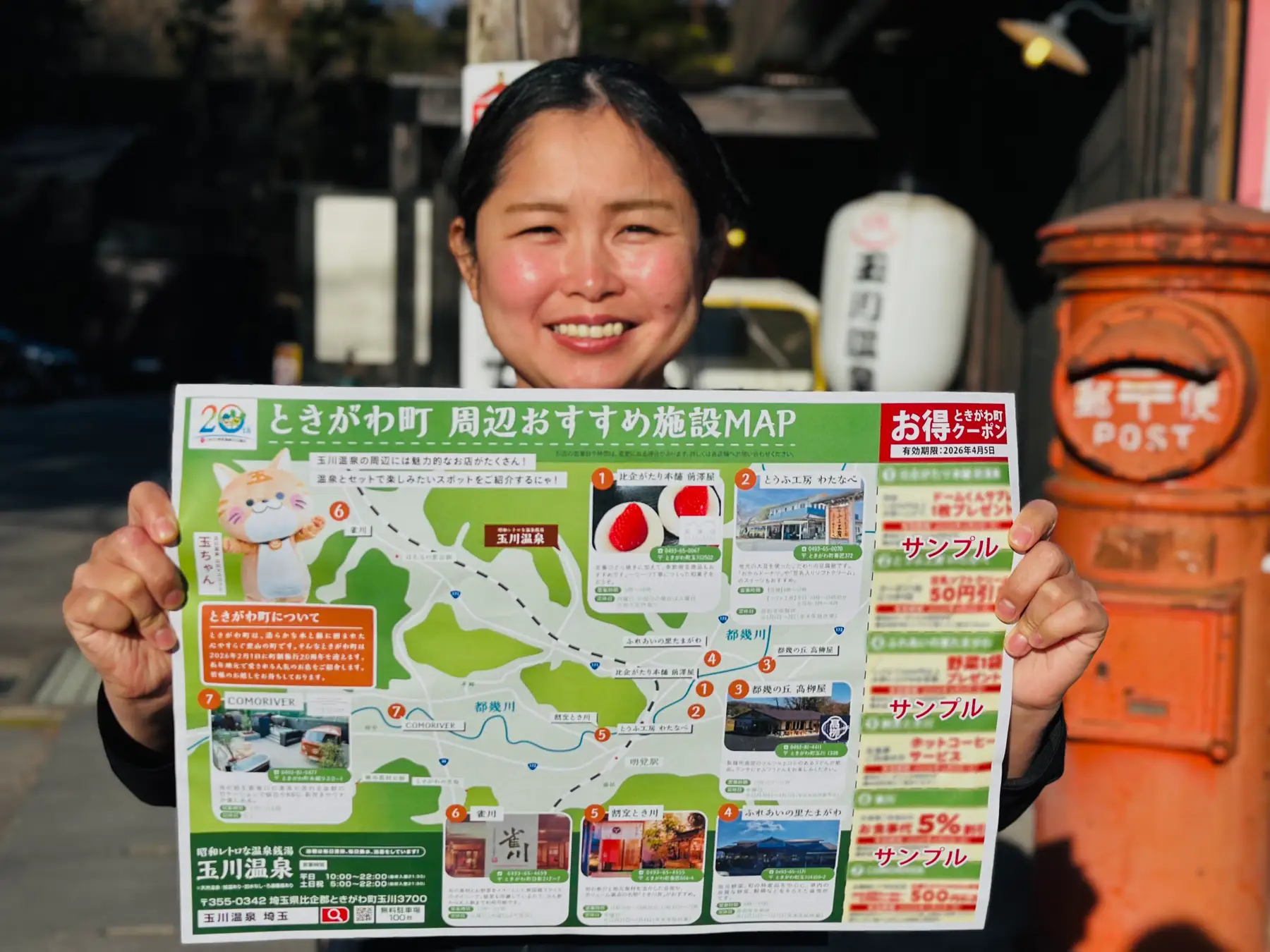 株式会社温泉道場(埼玉県比企郡ときがわ町、代表取締役 山崎寿樹)が運営する日帰り温泉・昭和レトロな温泉銭湯 玉川温泉(埼玉県比企郡ときがわ町)は、地元・ときがわ町の町制施行20周年を記念し、町内の飲食店や販売店と連携した周遊クーポン付きチラシを作成しました。