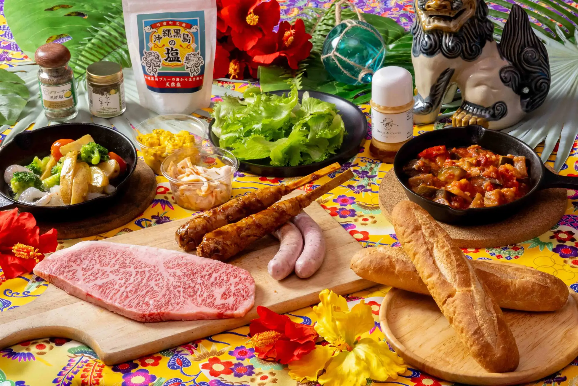 通常の宿泊BBQプランの牛ステーキを石垣牛へ変更して提供。こだわりの3種の調味料をお好みで合わせてお楽しみください。