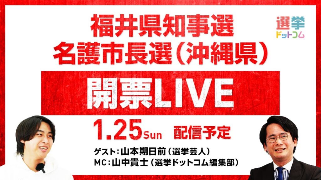 【1/25(日)22時〜開票LIVE】どうなる福井県知事選&名護市長選!選挙芸人・山本期日前が徹底解説!|選挙ドットコムちゃんねる