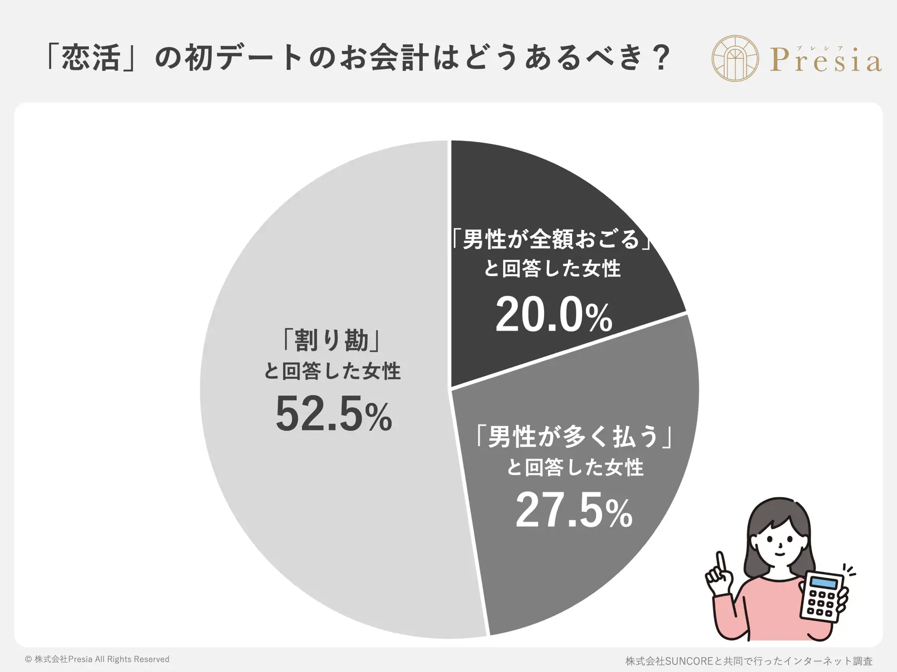 結婚相談所Presiaは、20代〜40代の未婚女性200名を対象に、「初デート代の『割り勘論争』に関する意識調査2025」を実施しました。
