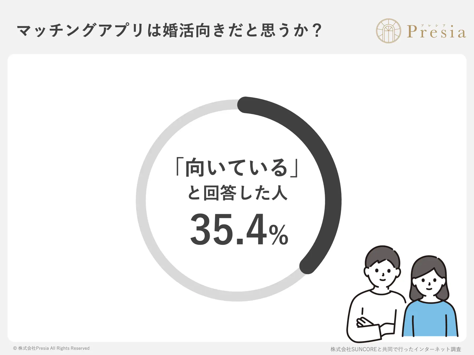 これらの経験を踏まえ、「マッチングアプリは婚活(結婚相手探し)に向いていると思いますか?」と尋ねたところ、「向いている」とポジティブに評価したのは35.4%でした。